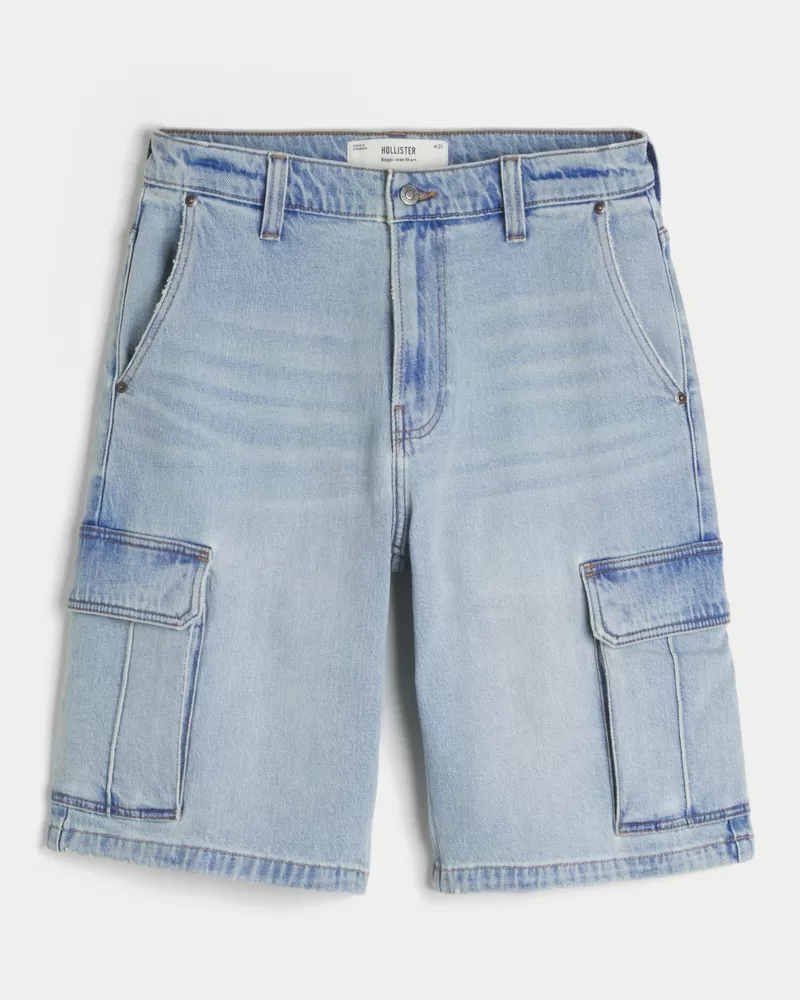 Comfortable denim shorts designed with a baggy leg and side cargo pockets. Fading and whiskering. Imported.