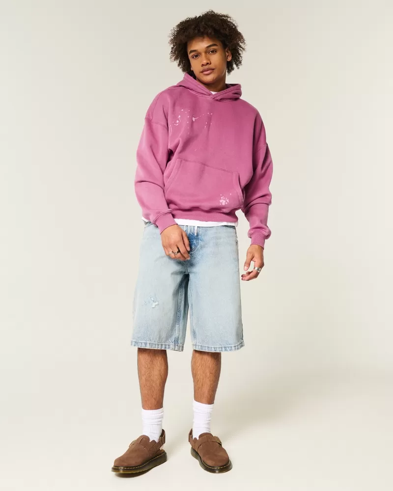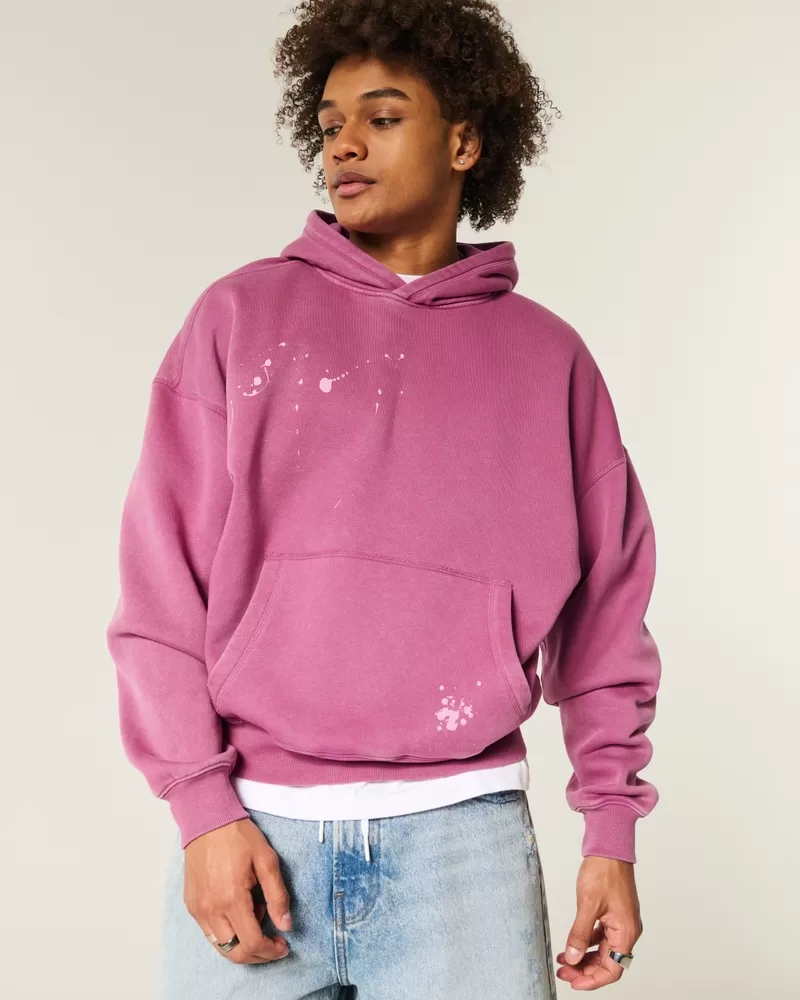 Made with super soft fleece fabric, this hoodie features paint splatter details and a washed look. Long sleeves, hood, front pouch pocket. Baggy Cinch Fit. Imported.