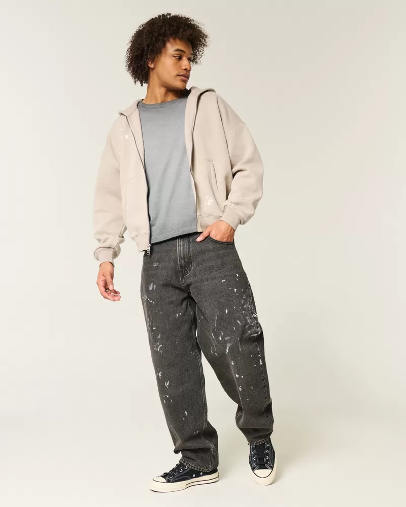 Made with super soft fleece fabric, this hoodie features paint splatter details, a zip-up closure and front pockets. Long sleeves, hood. Baggy Cinch Fit.