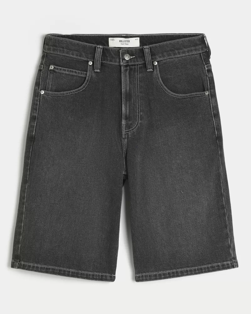 Comfortable denim shorts designed with a super baggy leg and below-the-knee length. Washed black with fading. Imported.
