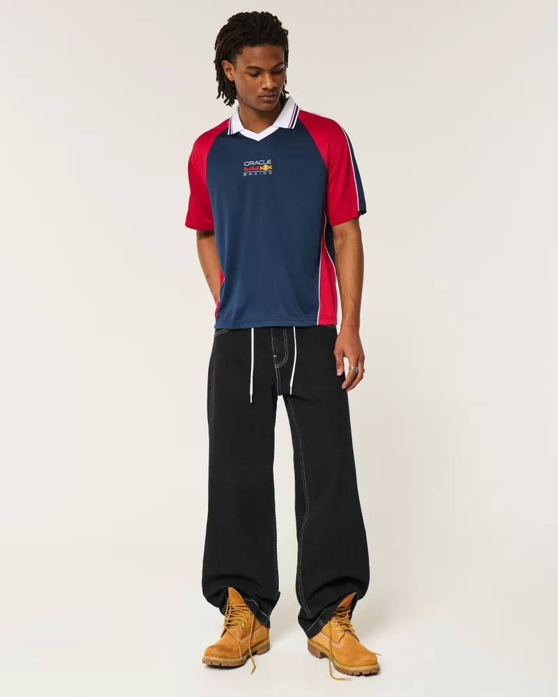 Ultra-comfortable denim jeans in black, designed with a super baggy leg. Contrast stitching. Imported.