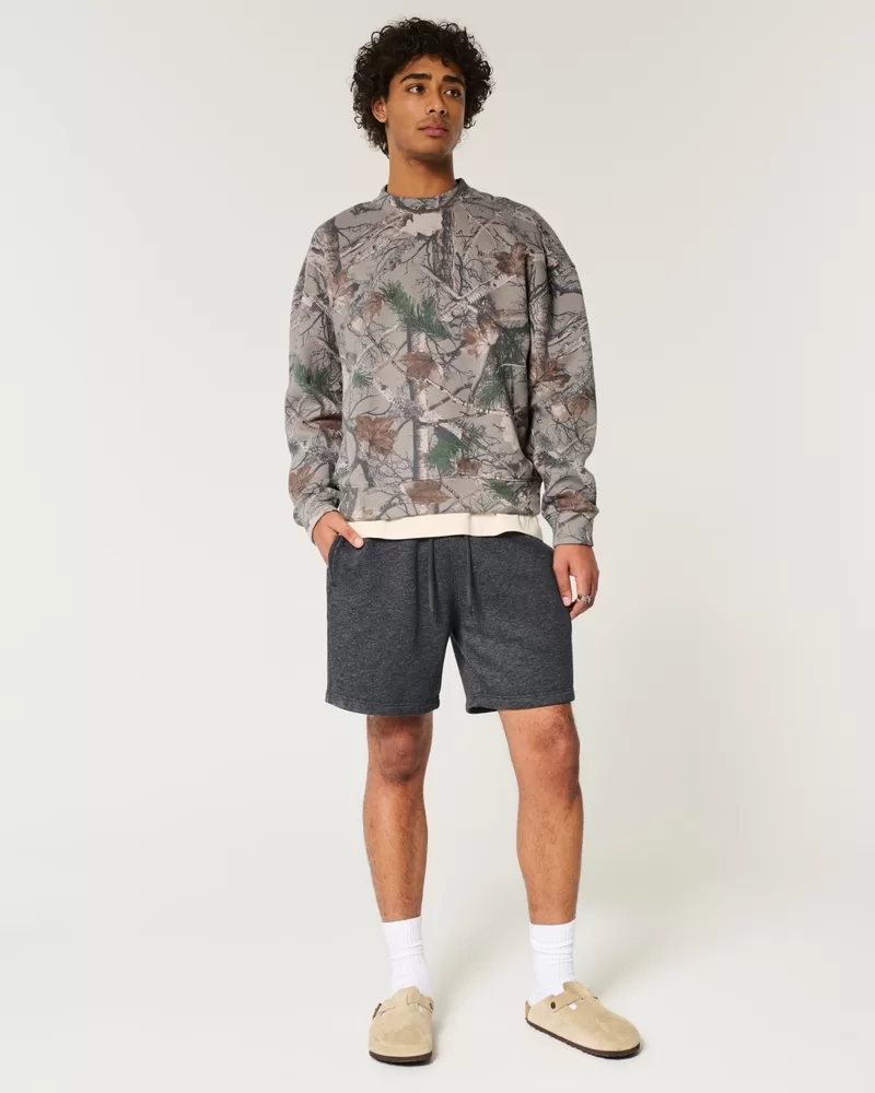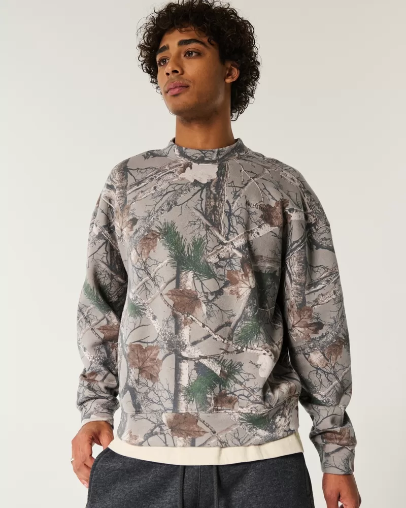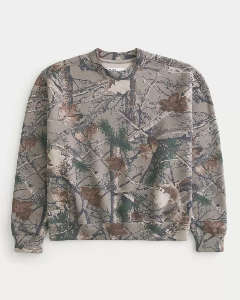 This ultra-comfortable and super soft fleece sweatshirt features logo embroidery at the left chest and a crew neckline. Long sleeves, camo pattern. Boxy Fit. Imported.