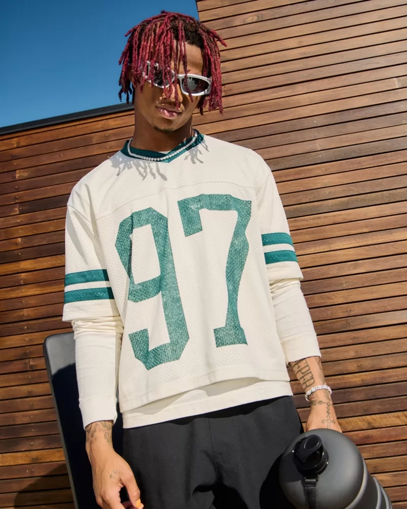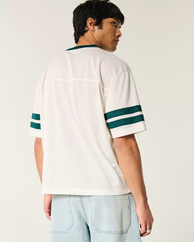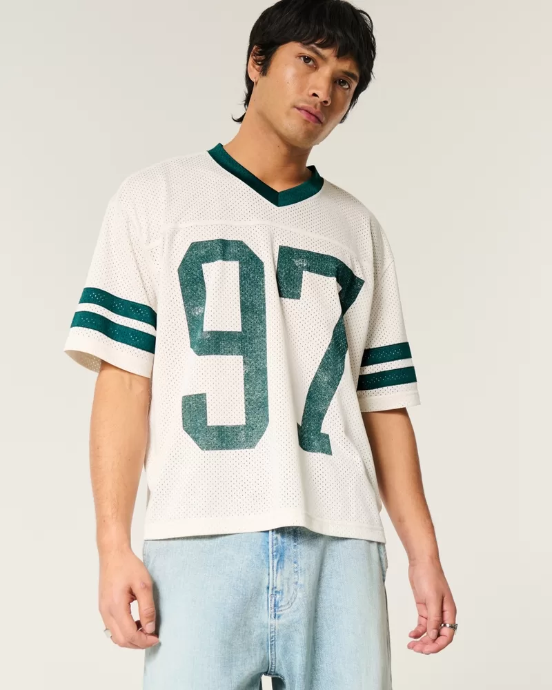 An ultra-comfortable athletic jersey in soft mesh fabric. Print number graphic, v-neckline, cropped length. Boxy Fit. Imported.