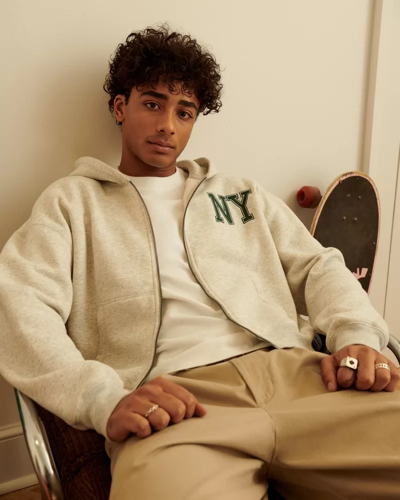 This super soft fleece hoodie features NY graphic applique at the left chest. Full zip-up closure, front pockets, long sleeves. Boxy Crop Fit.