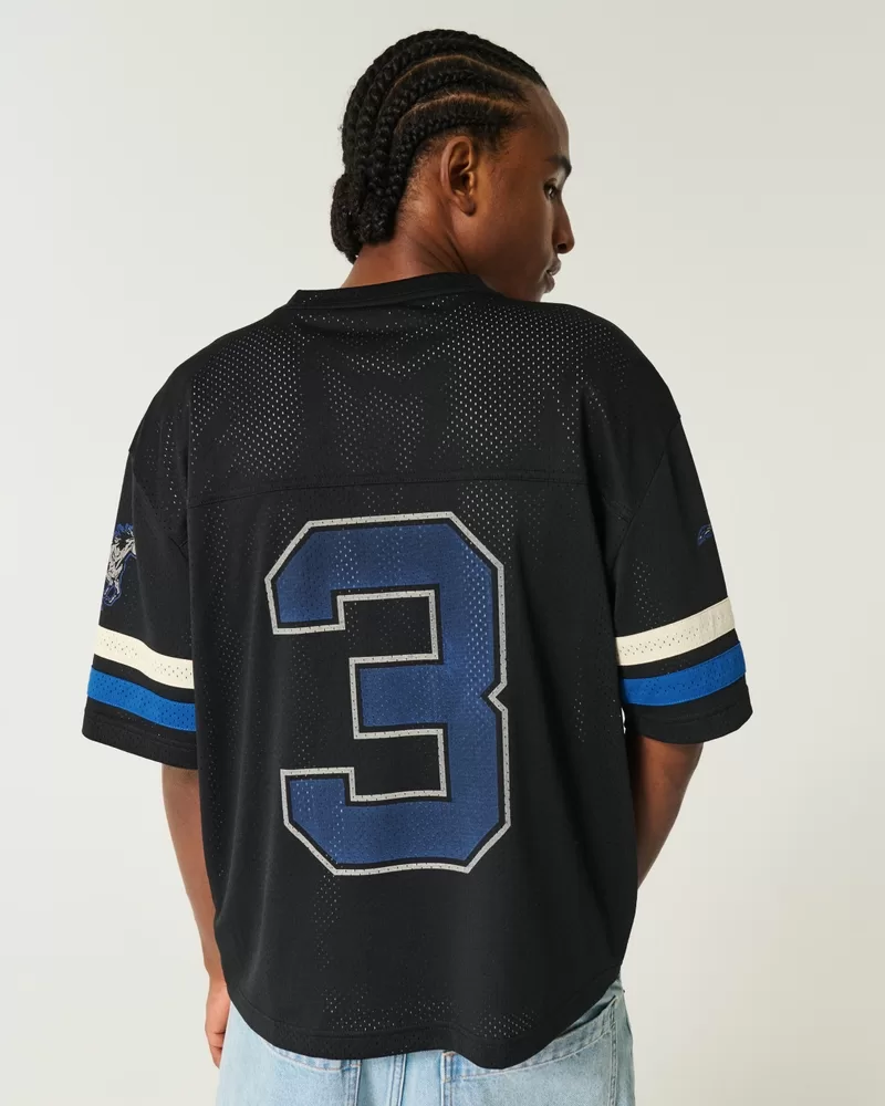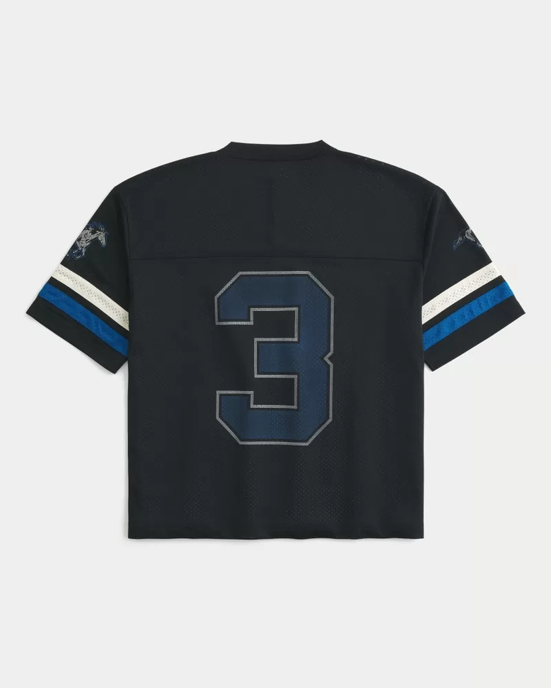 A classic jersey in soft mesh fabric, featuring Westside Mustangs print graphics at the front and a number graphic at the back. Short sleeves with print graphics, v-neckline. Boxy Crop Fit. Imported.