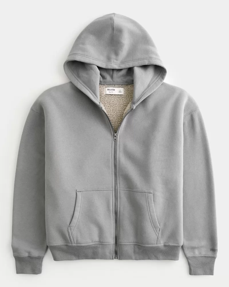 Ultra-comfortable and super soft, this hoodie features faux shearling lining and a full zip-up closure. Front pockets, long sleeves, hood. Boxy Fit. Imported.