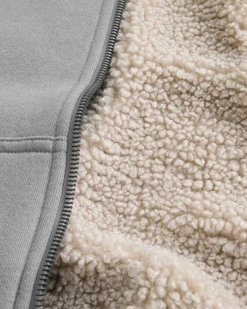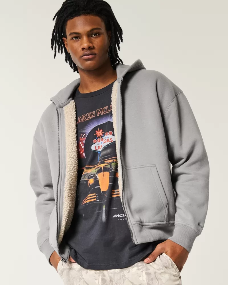 Boxy Faux Shearling-Lined Zip-Up Hoodie