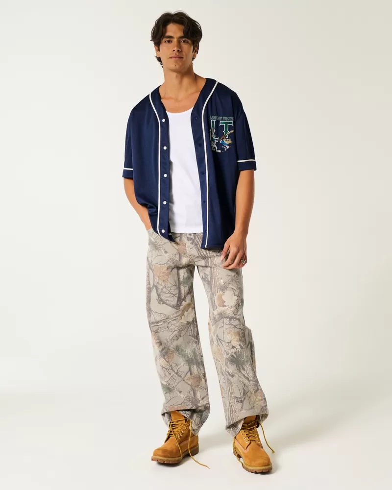 A classic baseball jersey in soft mesh fabric featuring official licensed Looney Tunes graphic embroidery at the left chest and back. Tipped details, full button closure, short sleeves, v-neckline. Boxy Fit. Imported.