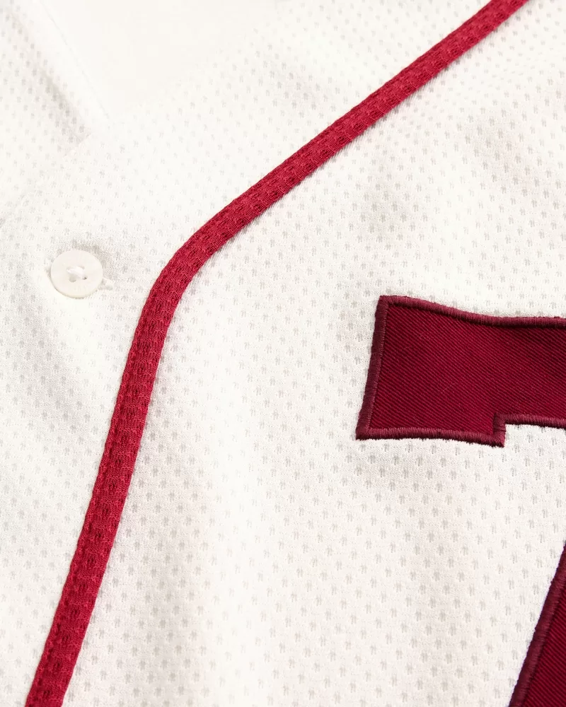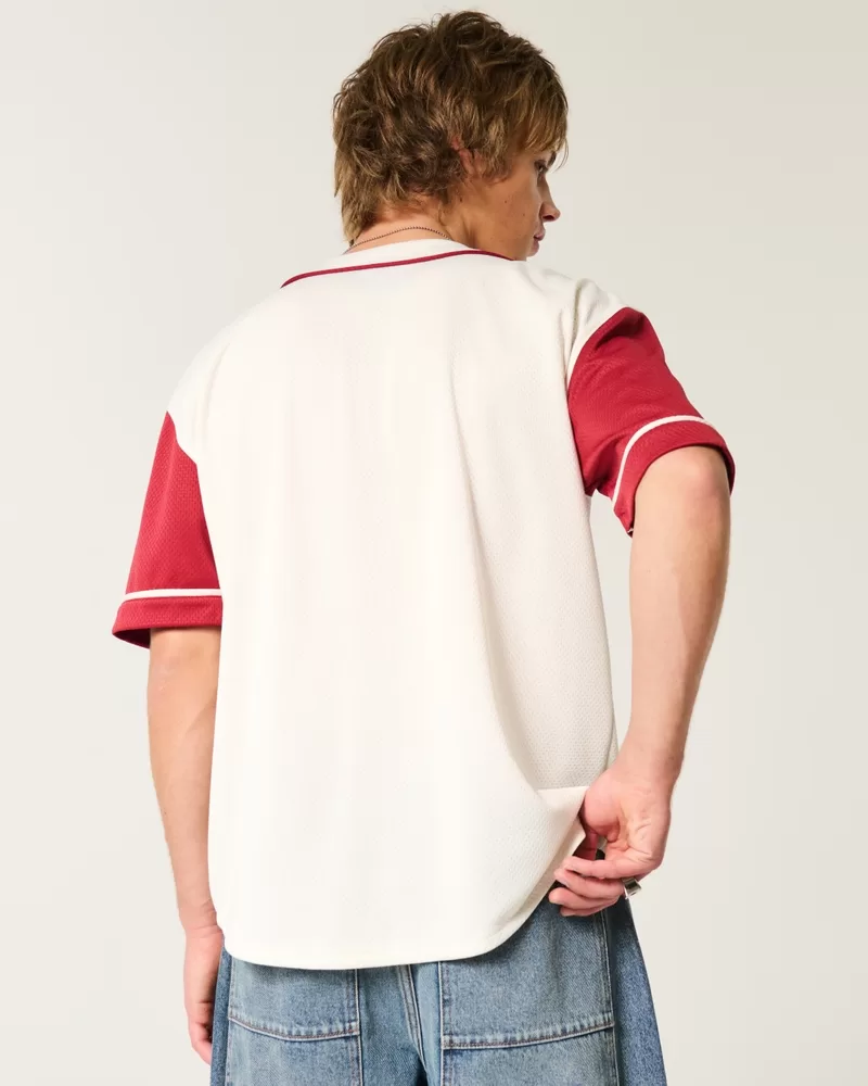 This classic baseball jersey features left chest number graphic applique and a full button closure. V-neckline, short sleeves, dimpled mesh fabric. Boxy Fit. Imported.