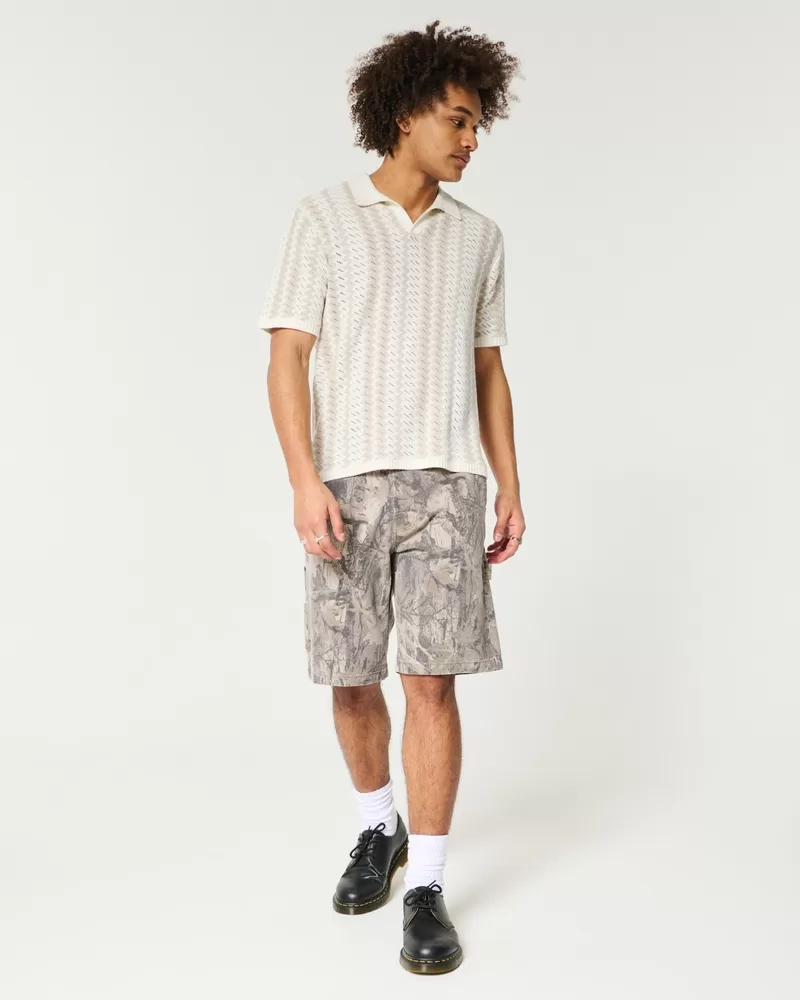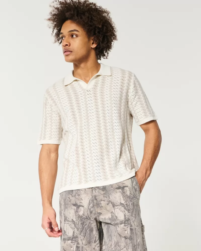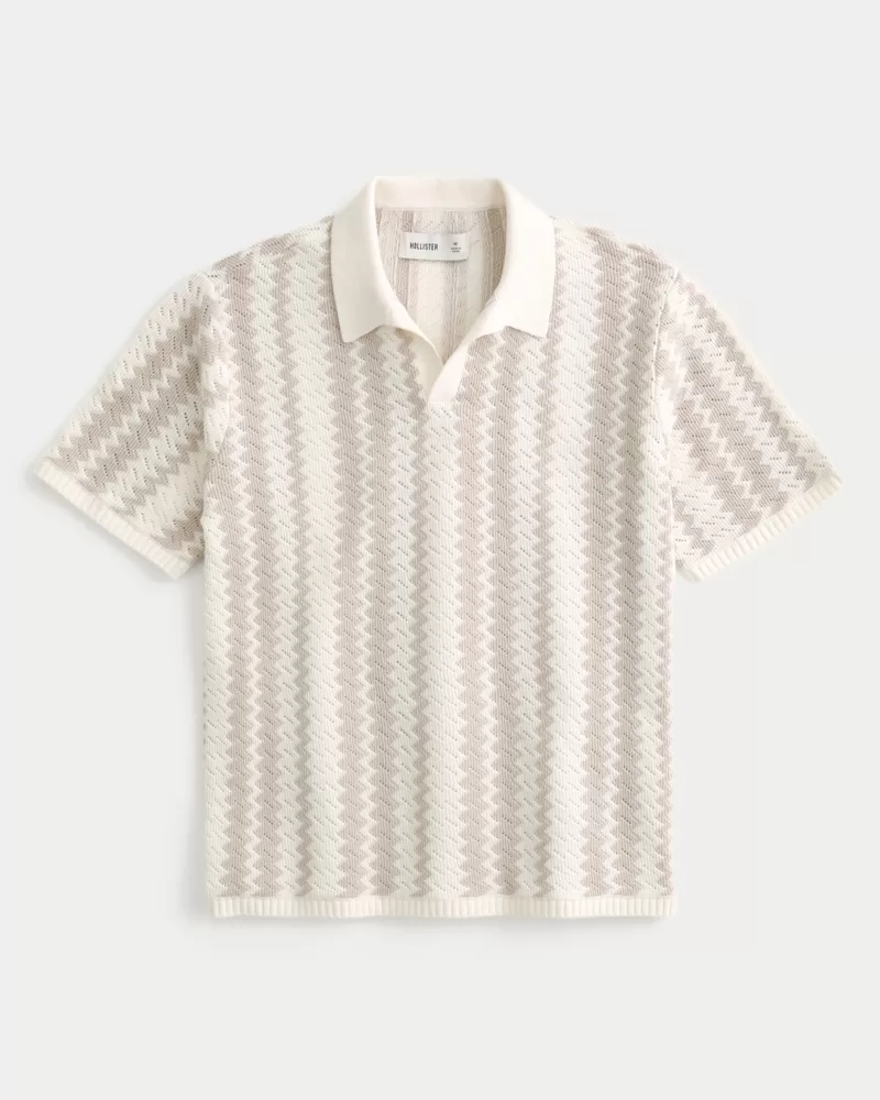 A super soft knit sweater polo featuring a two-color zig-zag pattern. Collar, short sleeves, ribbed hems. Boxy Fit. Imported.