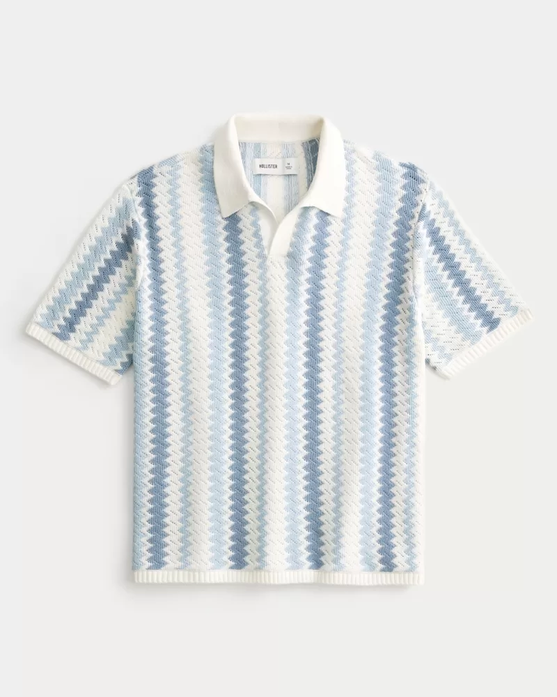 A super soft knit sweater polo featuring a two-color zig-zag pattern. Collar, short sleeves, ribbed hems. Boxy Fit. Imported.