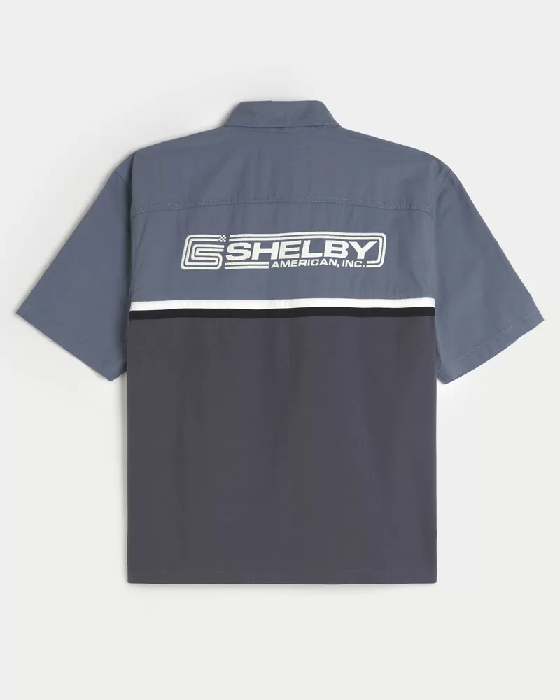 A classic workwear-style shirt featuring official licensed Shelby graphic embroidery at the left chest and back. Collar, short sleeves. Boxy Fit. Imported.