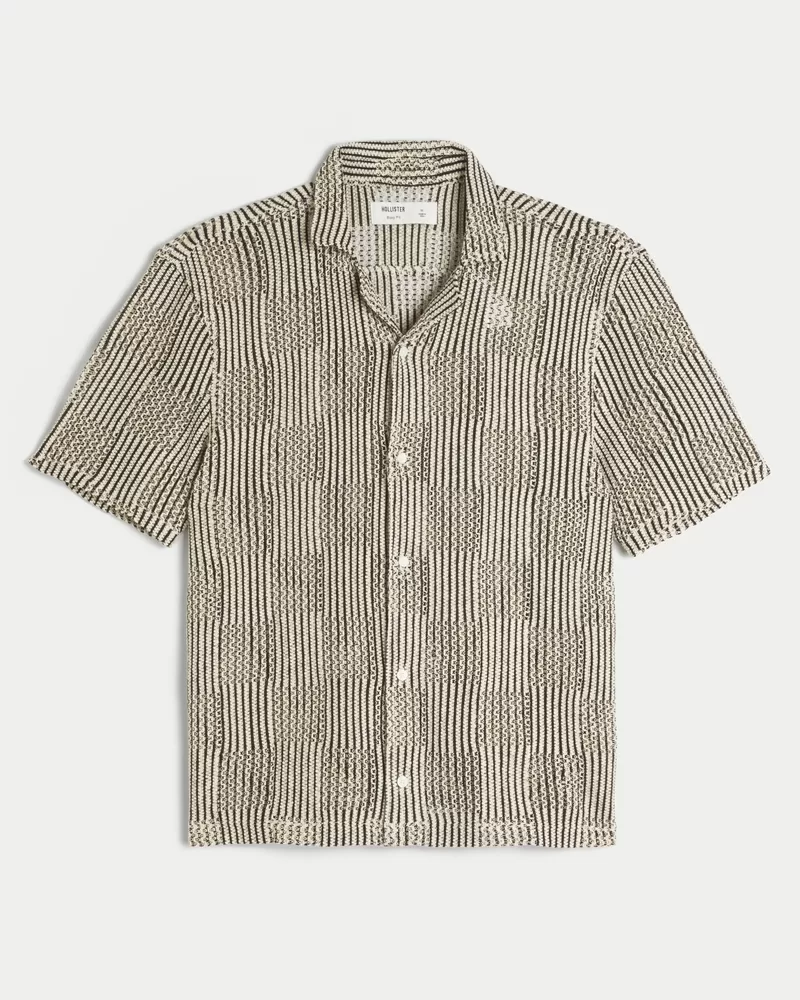An ultra-comfortable short-sleeve shirt in crochet-style fabric with a checkerboard pattern and full button closure. Collar. Boxy Fit. Imported.