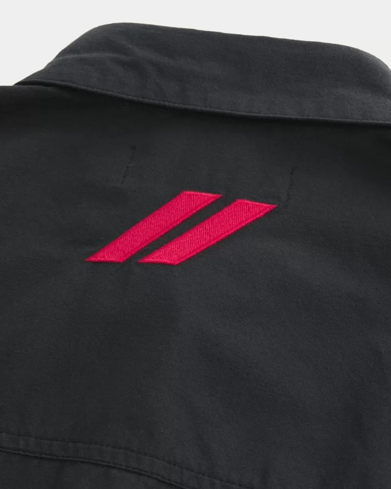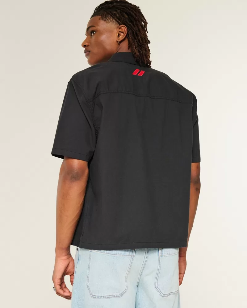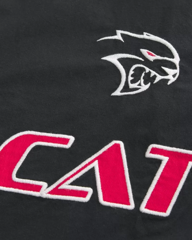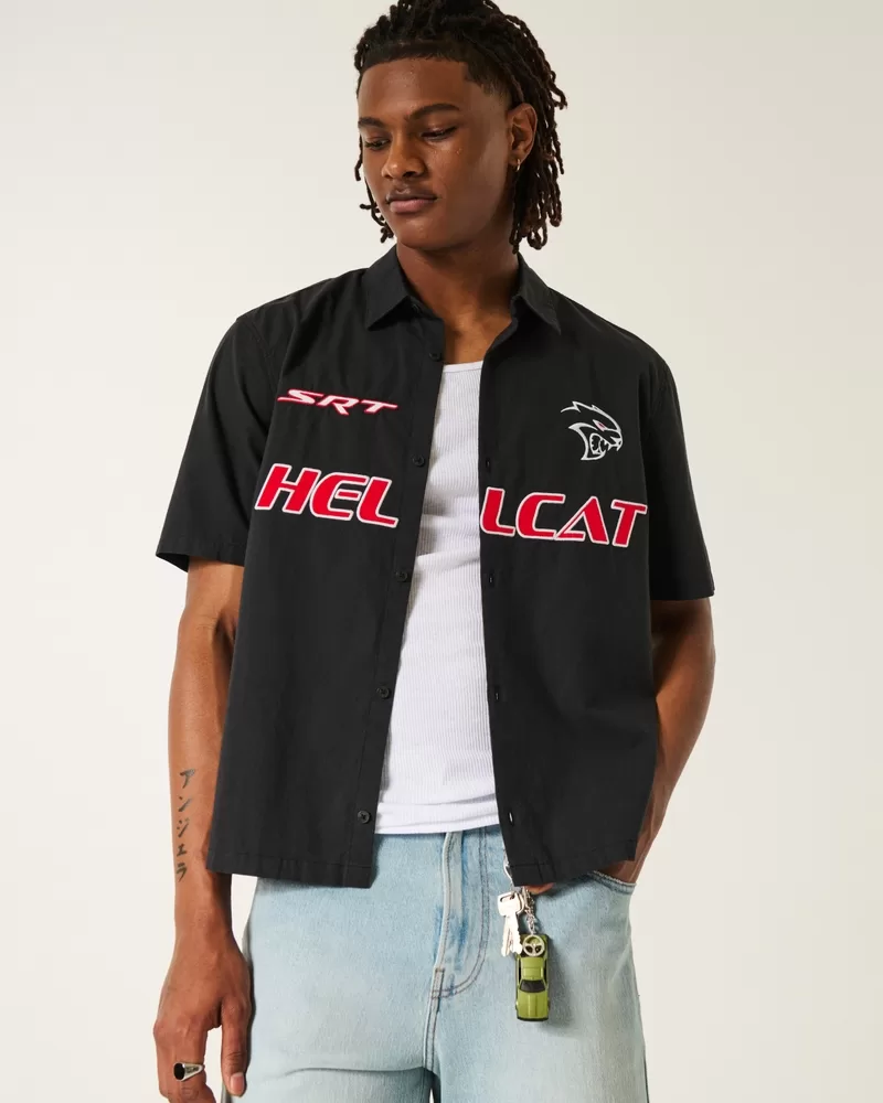 A classic workwear-style shirt with short sleeves and a full button closure. Official licensed Dodge Hellcat graphic embroidery at the front and back, collar, short sleeves. Boxy Fit. Imported.