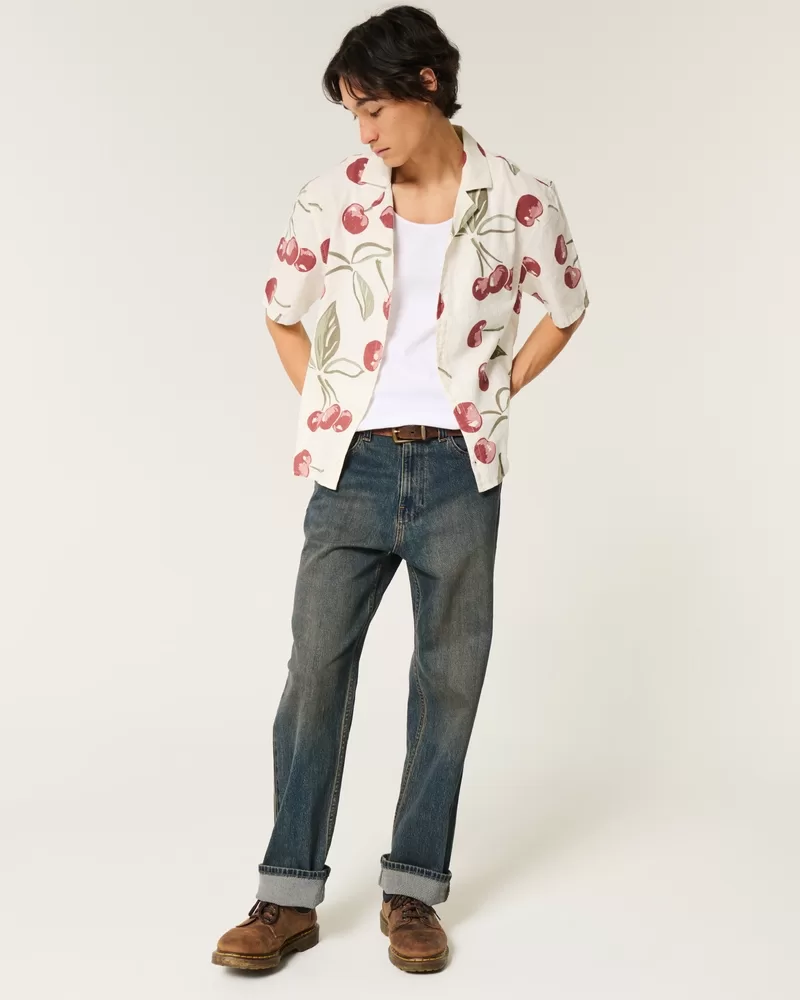 A classic shirt made with a soft linen blend. Full button closure, collar, short sleeves. Boxy Fit. Imported.