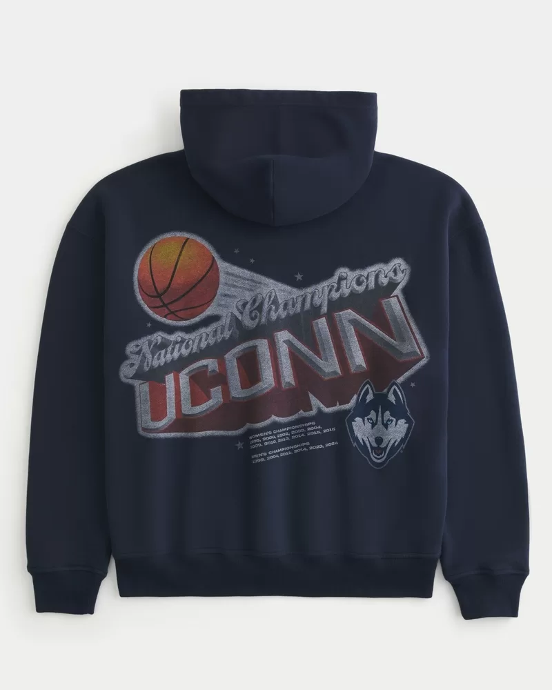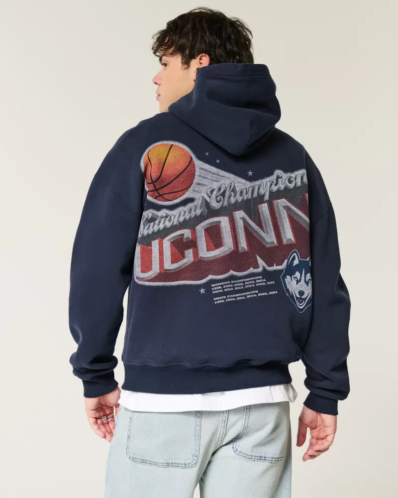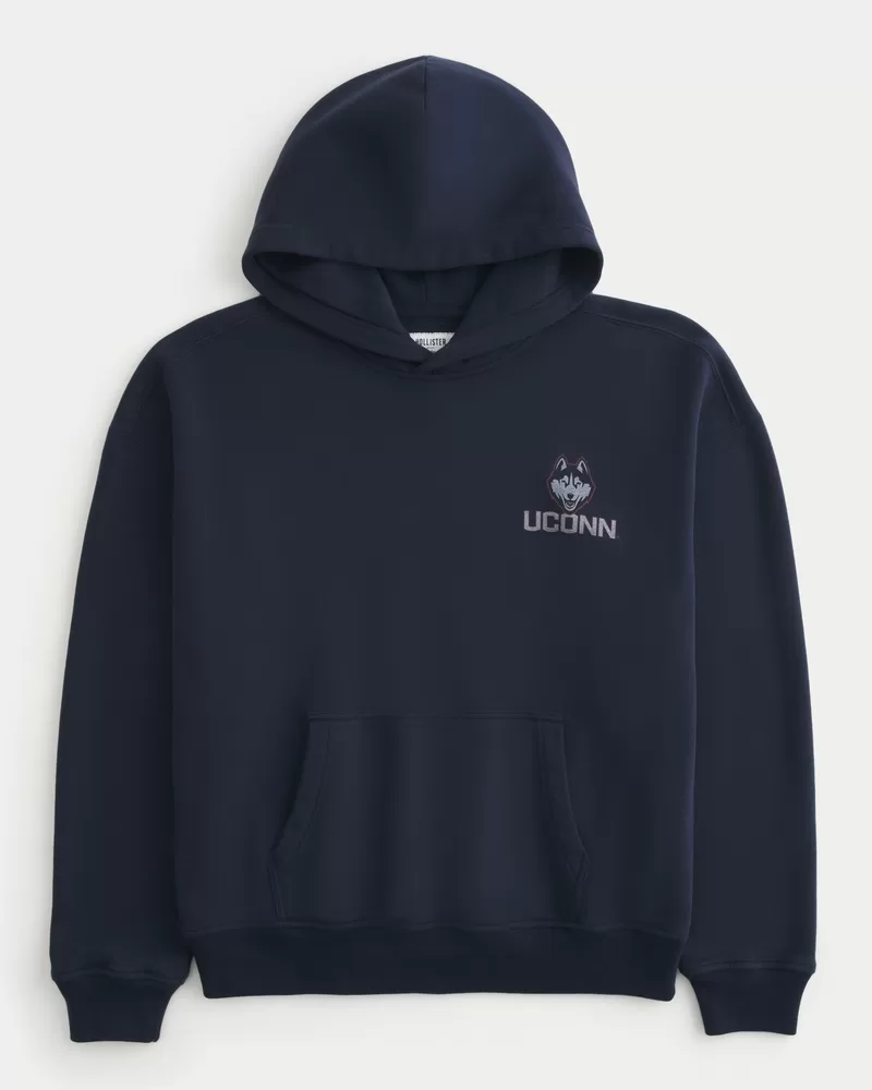 A super soft fleece hoodie featuring official licensed UConn University of Connecticut print graphics at the left chest and back. Hood, front pouch pocket, long sleeves. Boxy Fit. Imported.