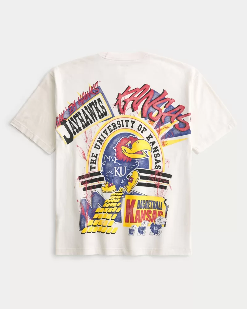 A super soft 100% cotton tee featuring official licensed University of Kansas Jayhawks print graphics at the front and back. Crew neckline, short sleeves. Boxy Fit. Imported.