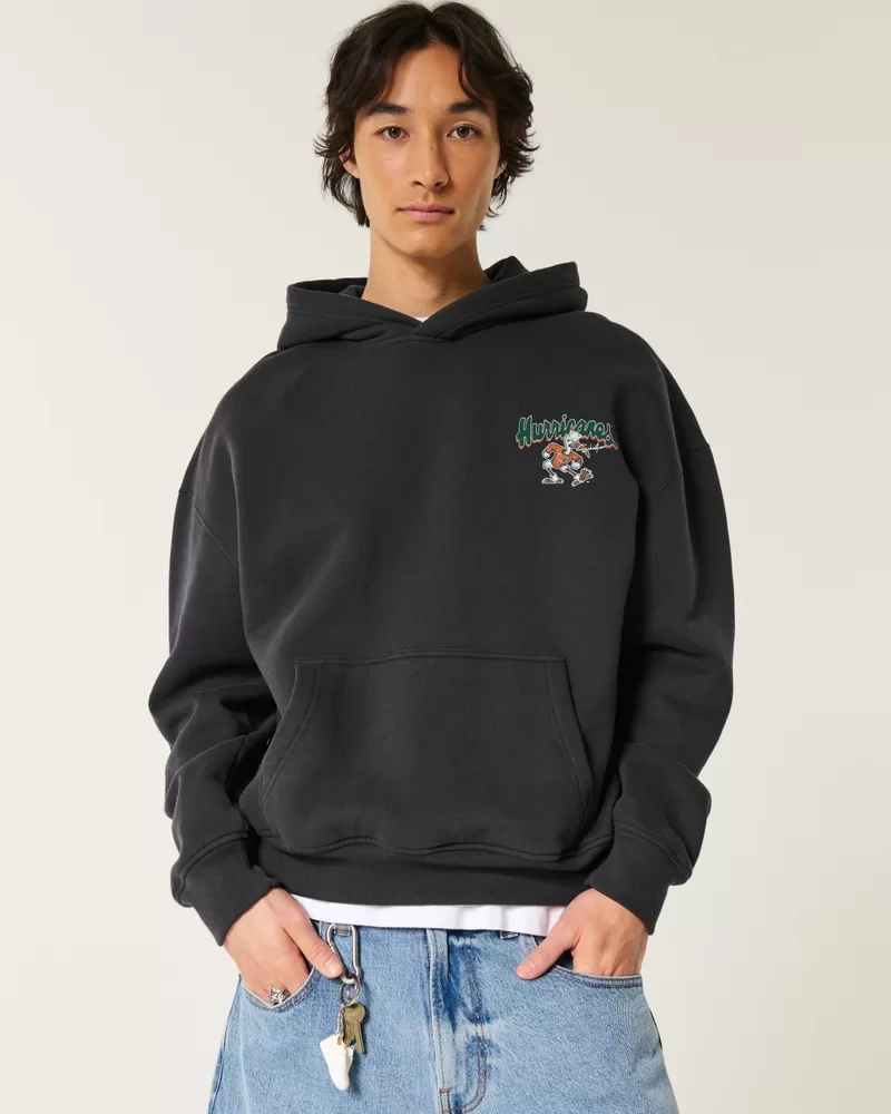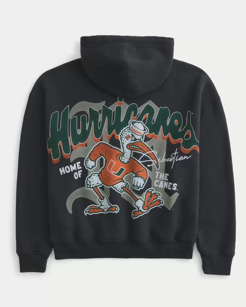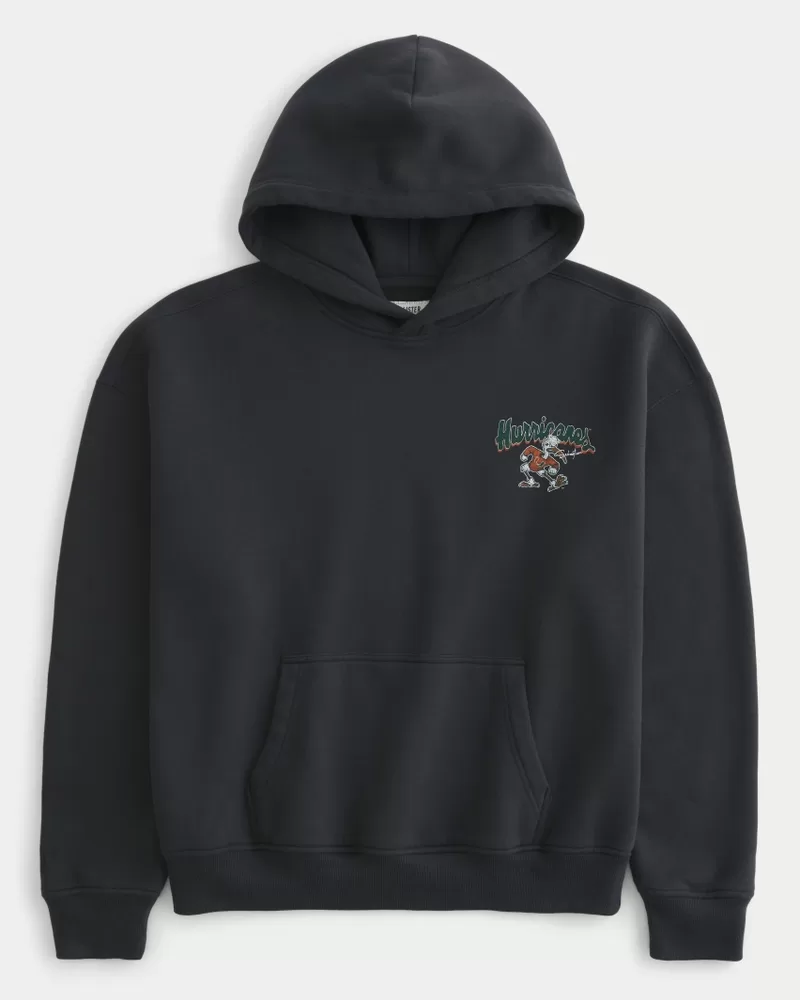 A super soft fleece hoodie featuring official licensed University of Miami Hurricanes print graphics at the left chest and back. Hood, front pouch pocket, long sleeves. Boxy Fit. Imported.