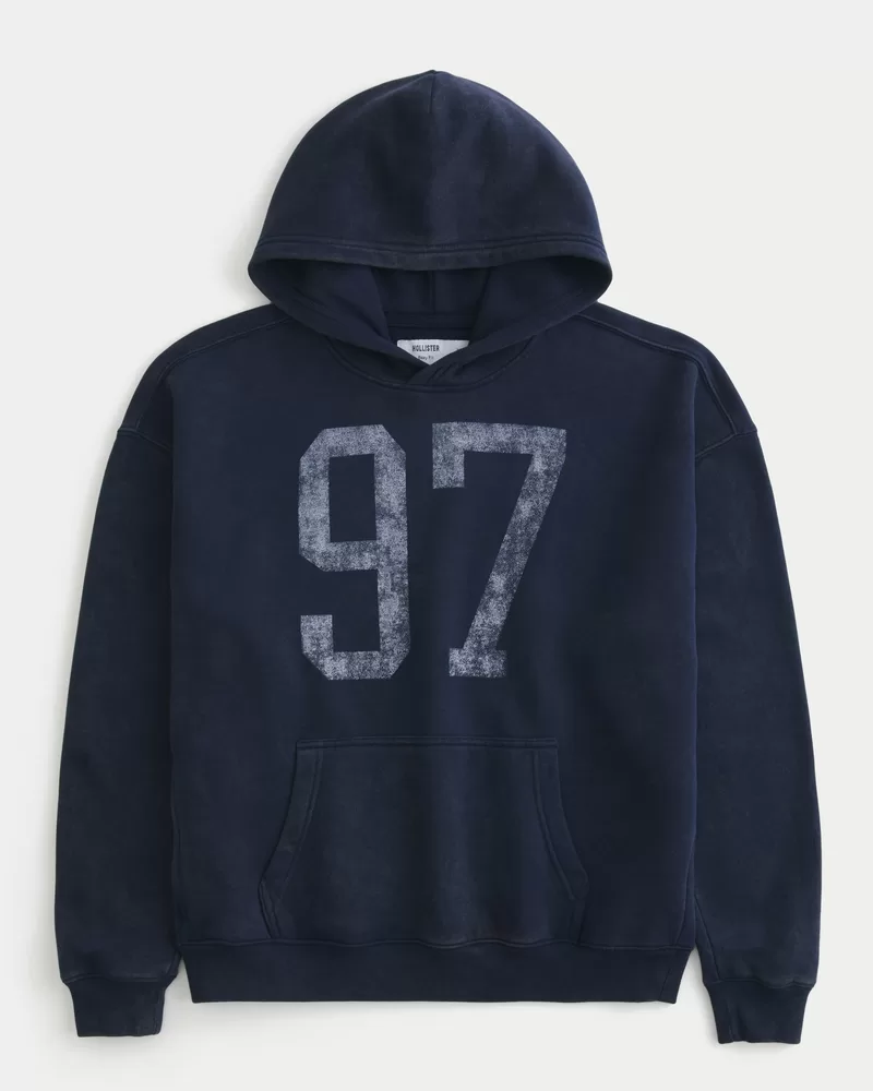 A super soft fleece hoodie featuring a 97 number print graphic with a washed look. Front pouch pocket, hidden zipper phone pocket, hood, long sleeves. Boxy Fit. Imported.