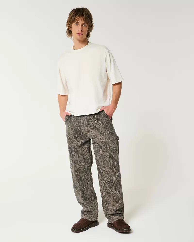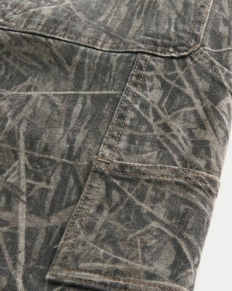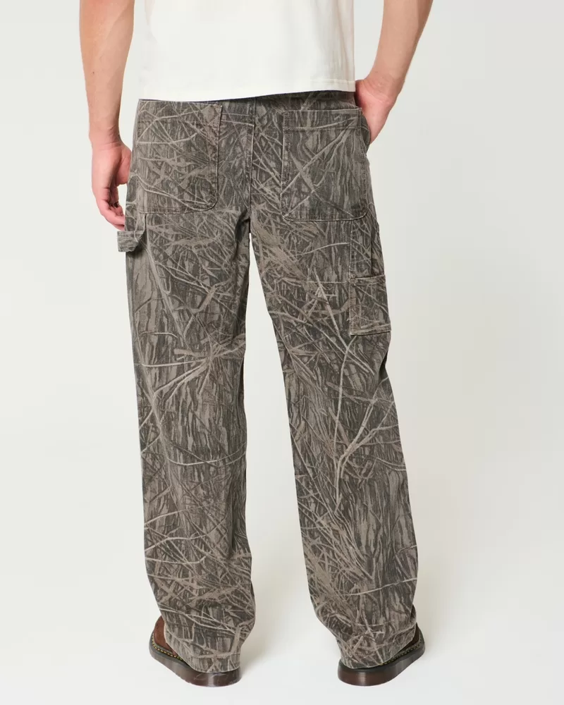 Comfortable denim painter jeans designed with a baggy leg, left loop detail and extra pockets. All-over camo pattern.
