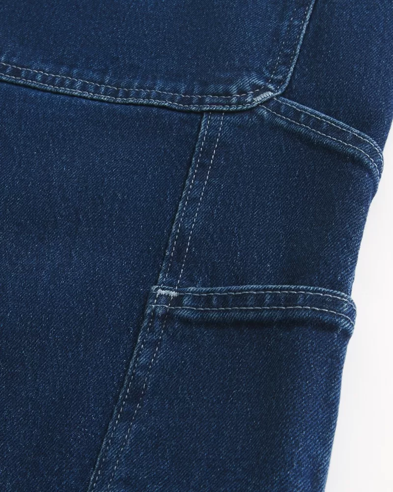 Ultra-comfortable painter-style jeans with stretch, designed with a baggy leg. Dark wash denim, left loop detail, extra pockets. Imported.