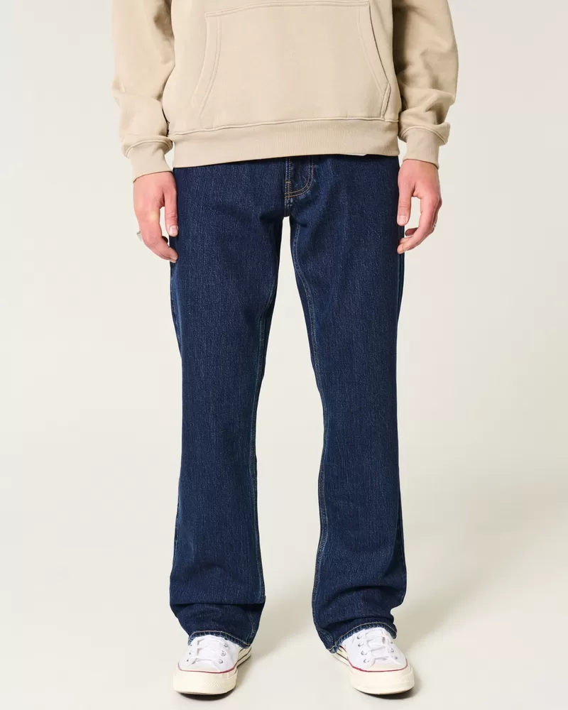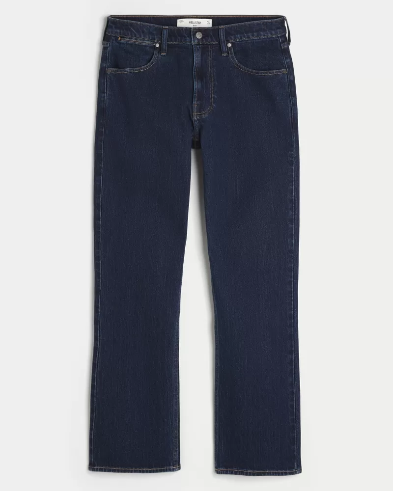 Comfortable jeans with stretch, designed with a classic boot cut. Dark wash denim with fading and whiskering.