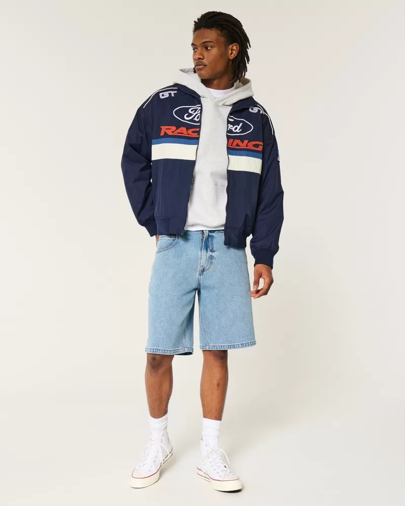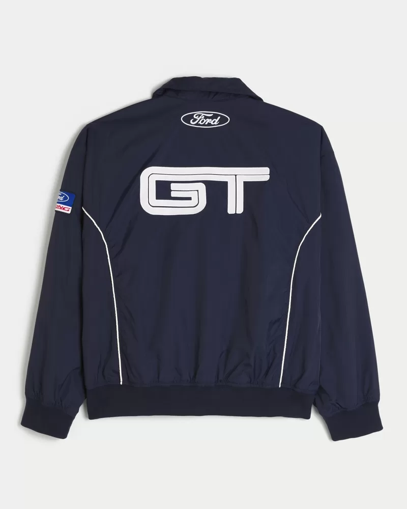 A classic racing jacket with a full zip-up closure, mock-neck collar and official licensed Ford Racing graphic applique and embroidery at the front, left sleeve and back. Banded hems, pockets. Imported.