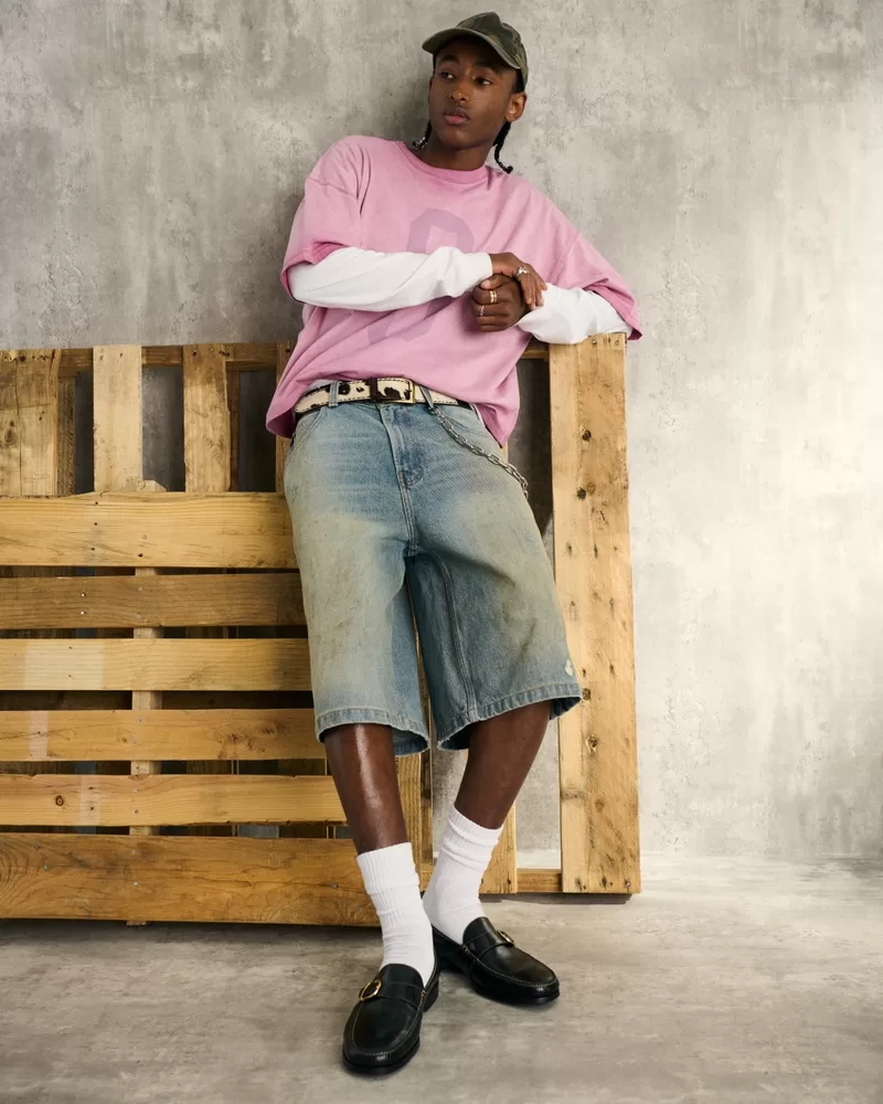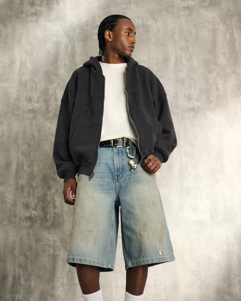 Comfortable denim shorts with greased and distressed details. Super baggy leg, fading, whiskering. Imported.