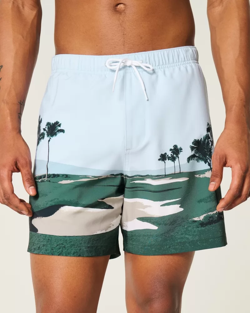 Shorter-length swim trunks that hit mid-thigh. Featuring comfortable 4-way stretch swim fabric and a 6″ inseam. Front pockets, mesh lining. Imported.