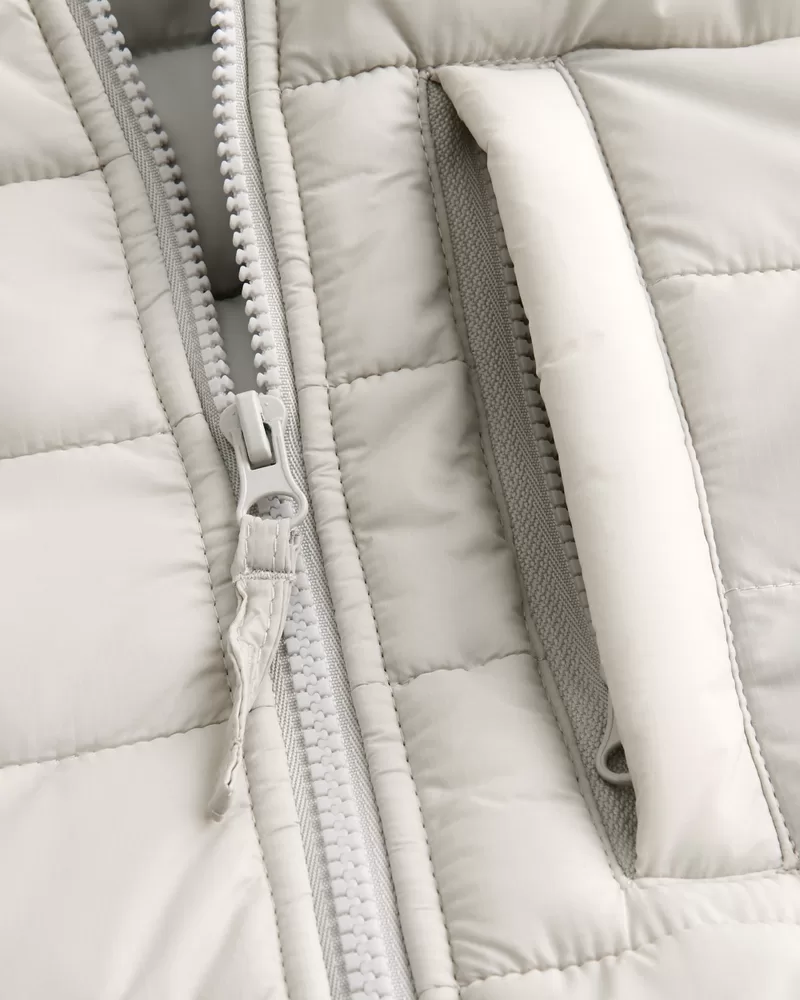 An ultra-comfortable, unlined puffer jacket designed with narrow quilted channels. Full zip-up closure, front pockets, cuff hem logo detail, hood, left chest zipper pocket Imported.