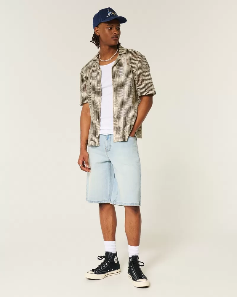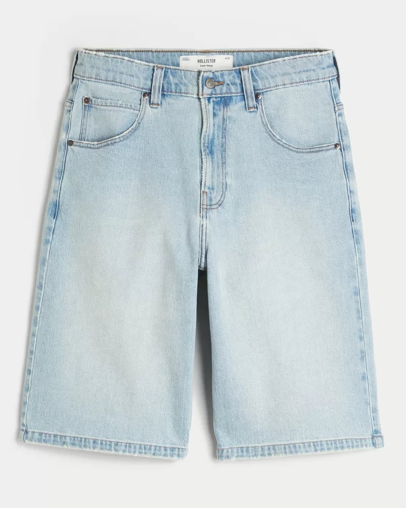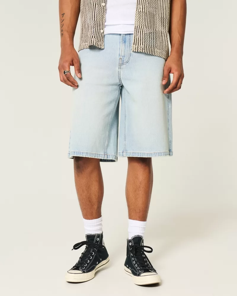 Comfortable denim shorts in a light wash, designed with a super baggy leg. Fading, dice graphic embroidery at back pocket. Imported.