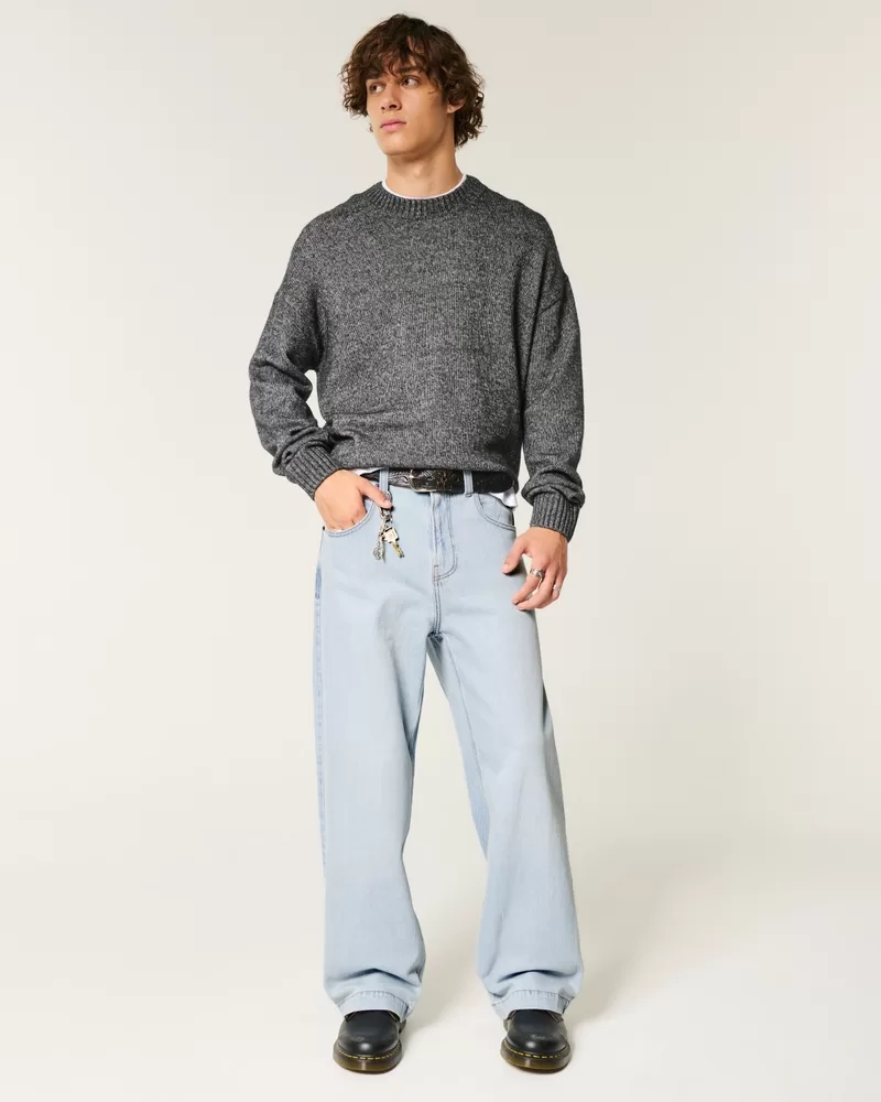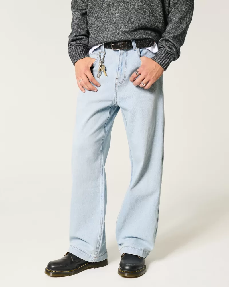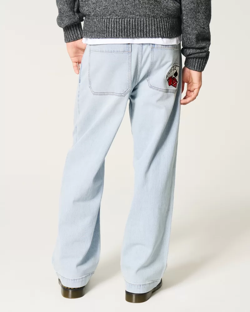 Ultra-comfortable jeans with stretch, designed with a super baggy leg. Playing cards graphic embroidery at the back pocket, light wash. Imported.