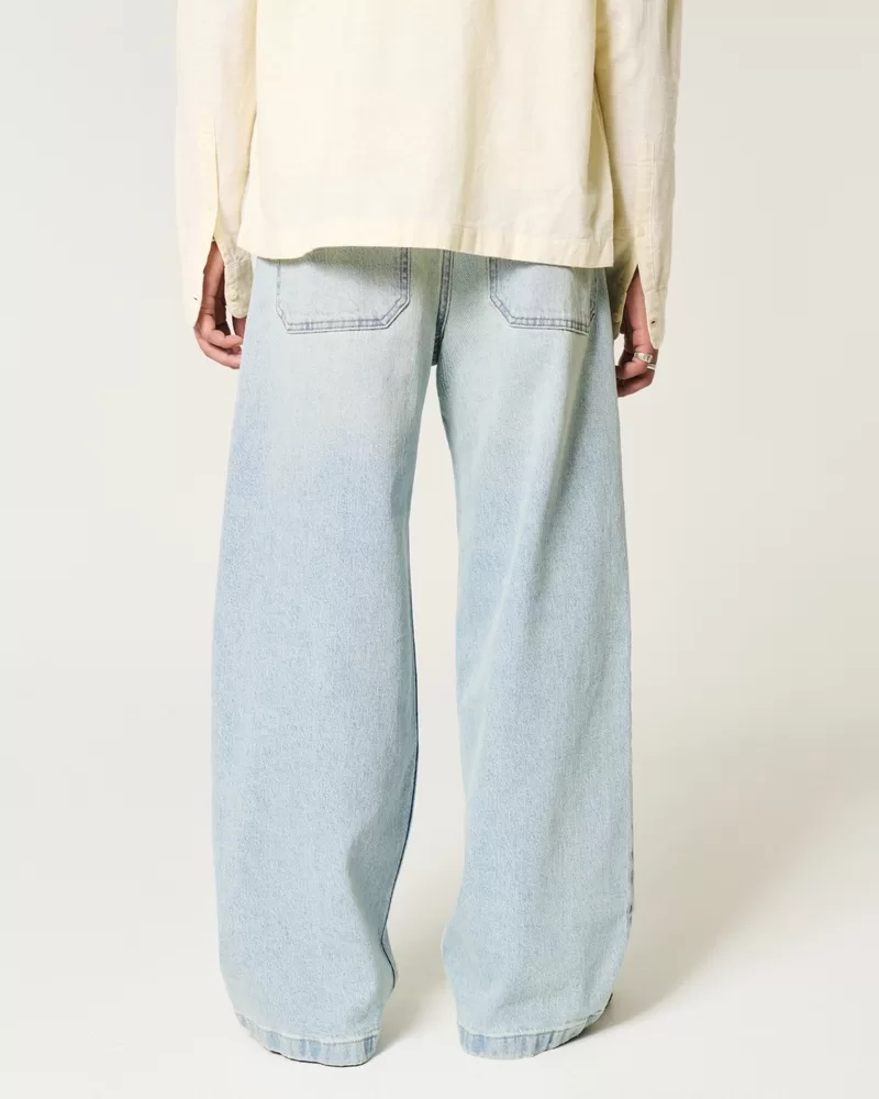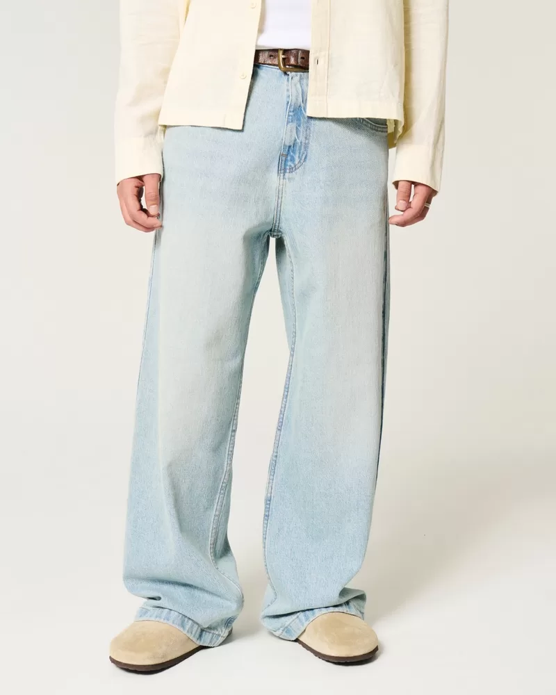 Ultra-comfortable jeans with stretch, designed with a super baggy leg. Light wash denim with fading and whiskering. Imported.