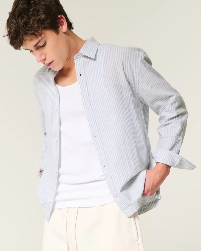 This classic button-through shirt is made with a soft linen blend. Collar, long sleeves. Imported.
