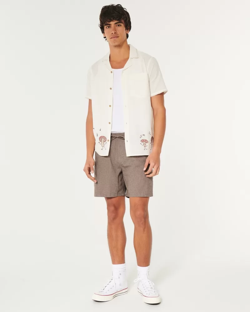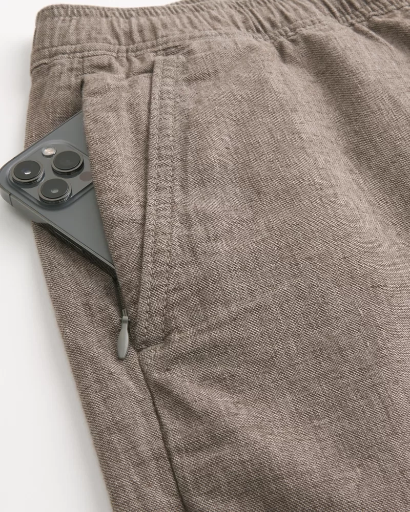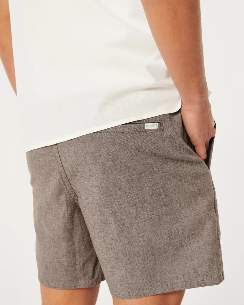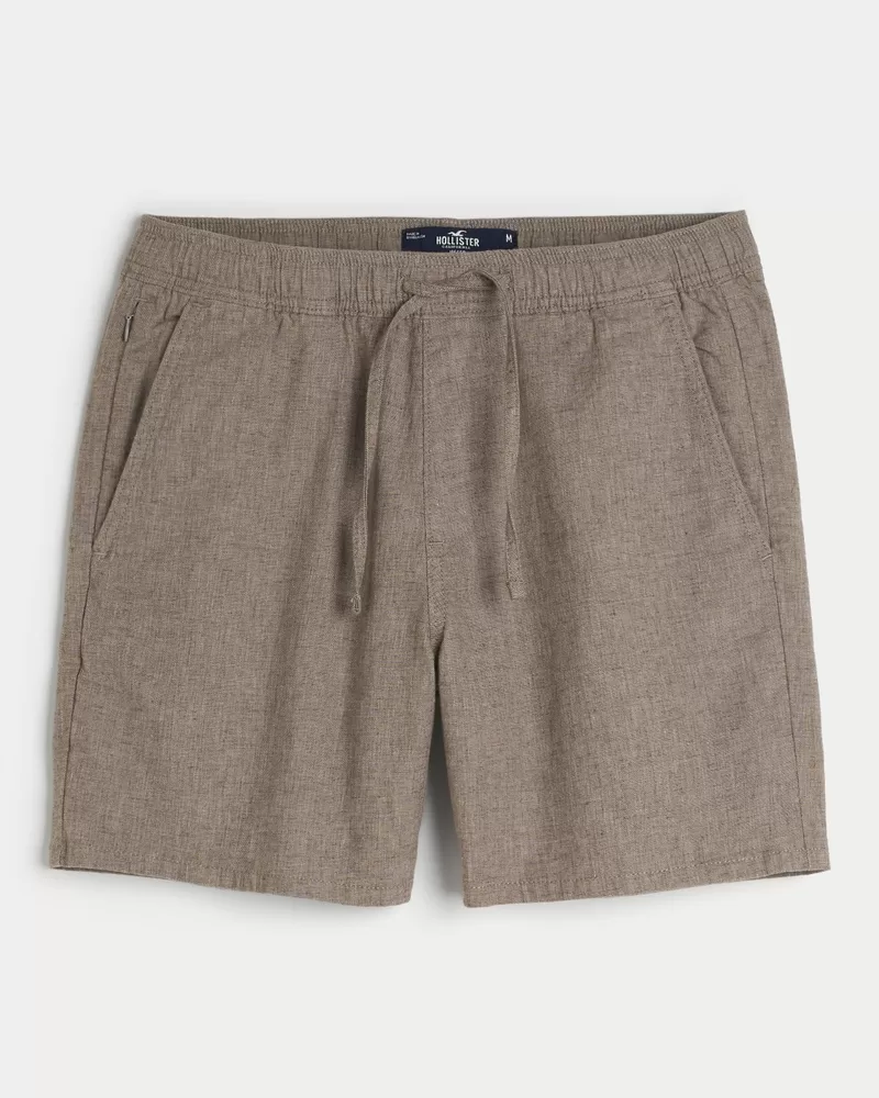 Ultra-comfortable jogger shorts in a soft linen blend with Hollister Epic Flex. Drawstring waist, pockets, right zipper pocket, 7″ inseam. Imported.