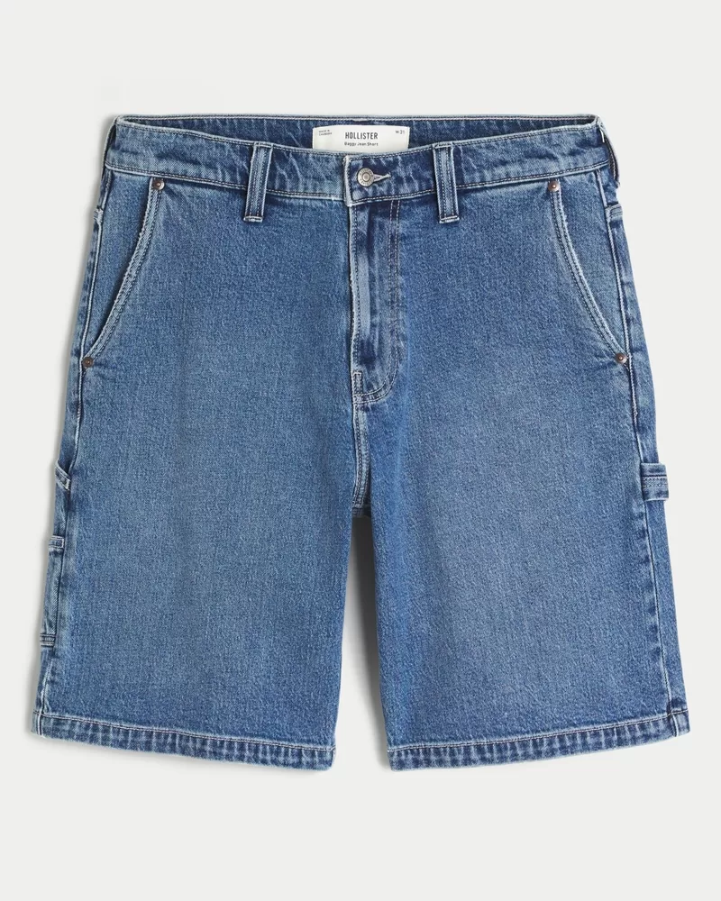 90s-inspired denim jean shorts in a medium wash, designed with a baggy leg. Left loop detail, extra pockets. Imported.