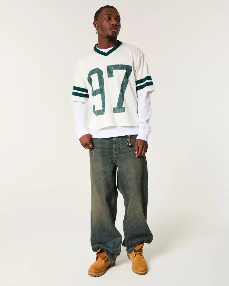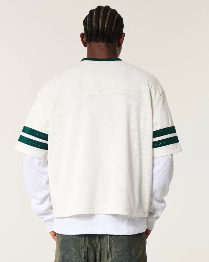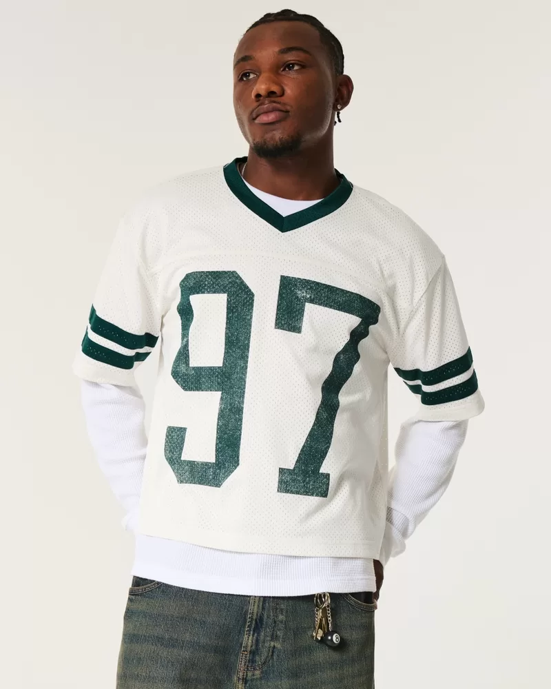 A super soft and ultra-comfortable football jersey in mesh fabric. V-neckline, varsity-style print graphics, short sleeves. Imported.