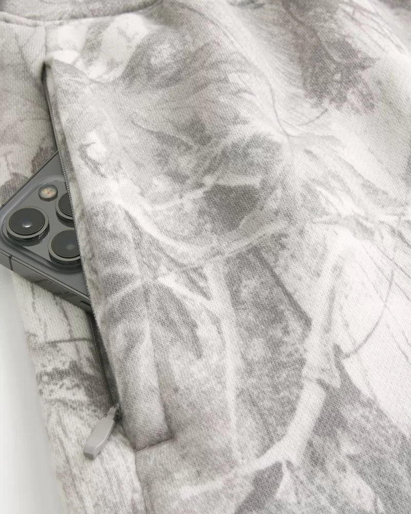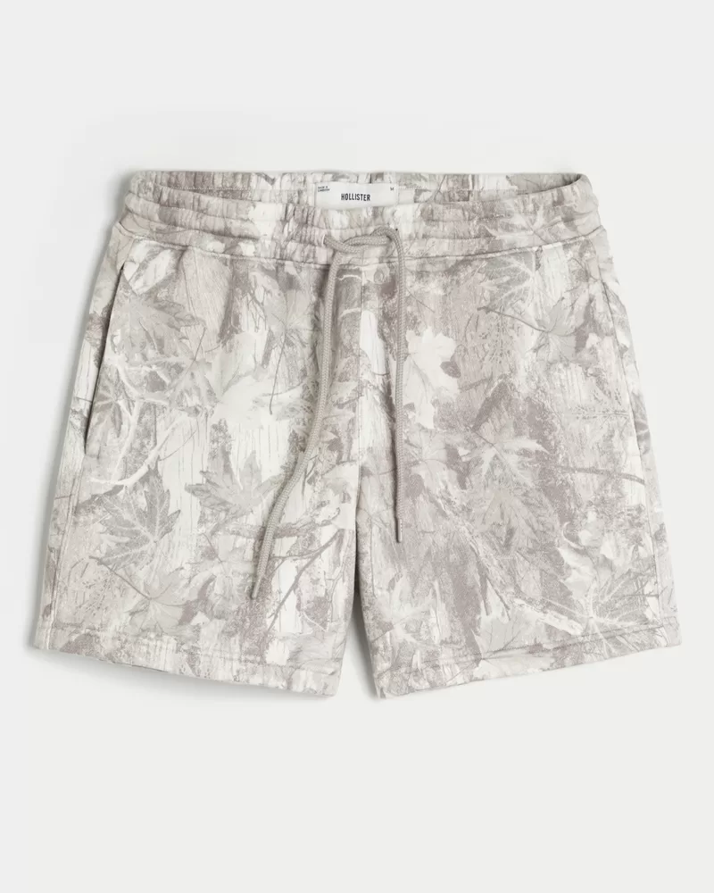 Super soft fleece shorts designed with a loose leg that hits mid-thigh. Drawstring waist, pockets, right zipper pocket, all-over camo pattern, embroidered logo detail at left hem. Imported.