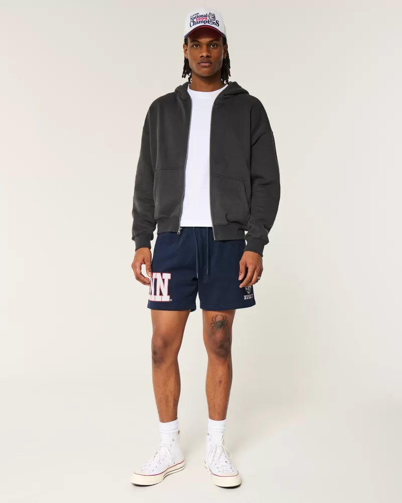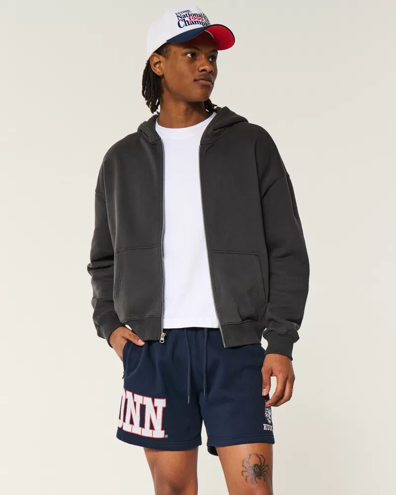 Super soft fleece shorts designed with a mid-thigh length and drawstring waist. Official licensed UConn University of Connecticut Huskies print graphics, pockets, right zipper pocket.
