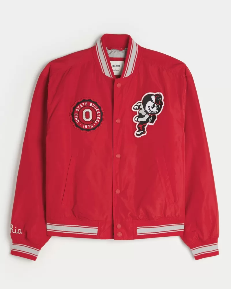 A classic collegiate jacket designed with a bomber silhouette, featuring official licensed Ohio State University Buckeyes graphic patches at the left and right chest, plus Ohio embroidery at the right sleeve. Striped trims, snap closure. Banded hems.