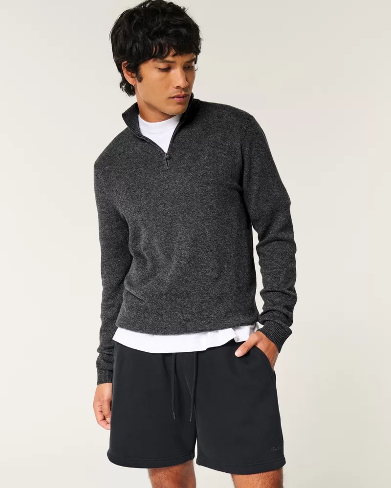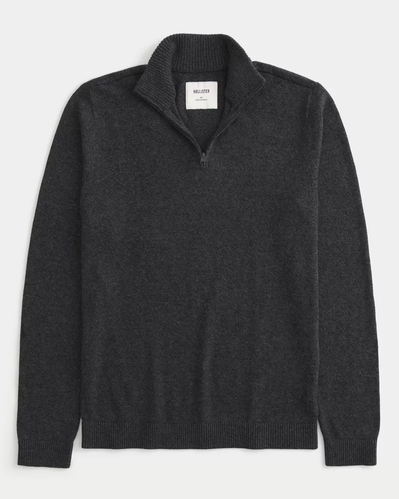 A super soft sweater with a mock-neck collar and quarter-zip closure. Ribbed trims, long sleeves, embroidered left chest logo icon. Imported.