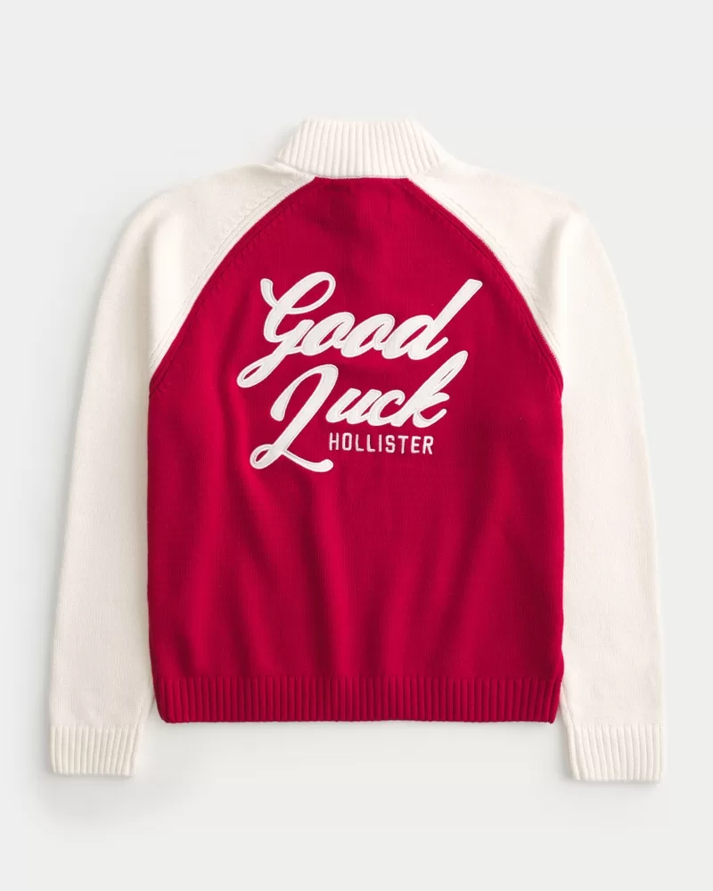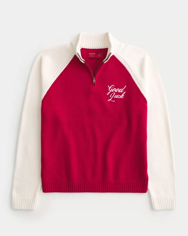An ultra-comfortable and super soft sweater with a mock-neck collar, quarter-zip closure and raglan sleeves. Lunar New Year-inspired Good Luck graphic embroidery at the left chest and applique at the back. Ribbed trims, long sleeves. Relaxed Fit. Imported.