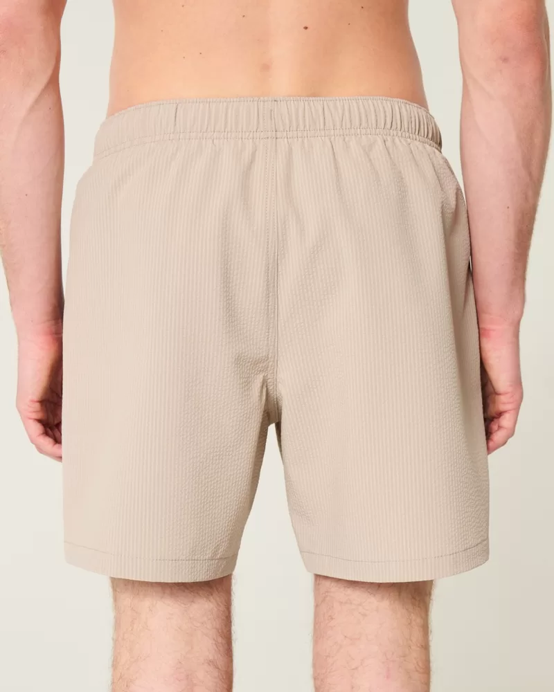 Shorter-length swim trunks that hit mid-thigh. Featuring comfortable 4-way stretch seersucker swim fabric and a 6″ inseam. Front pockets, mesh lining. Imported.