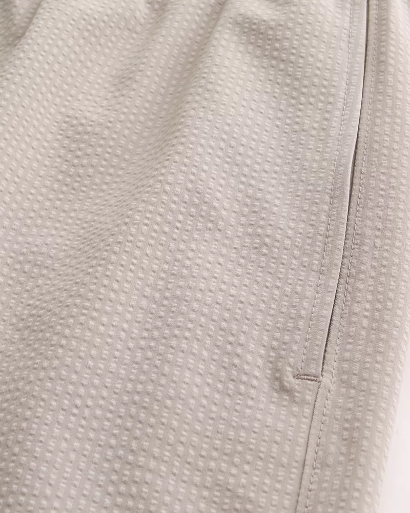 Shorter-length swim trunks that hit mid-thigh. Featuring comfortable 4-way stretch seersucker swim fabric and a 6″ inseam. Front pockets, mesh lining.