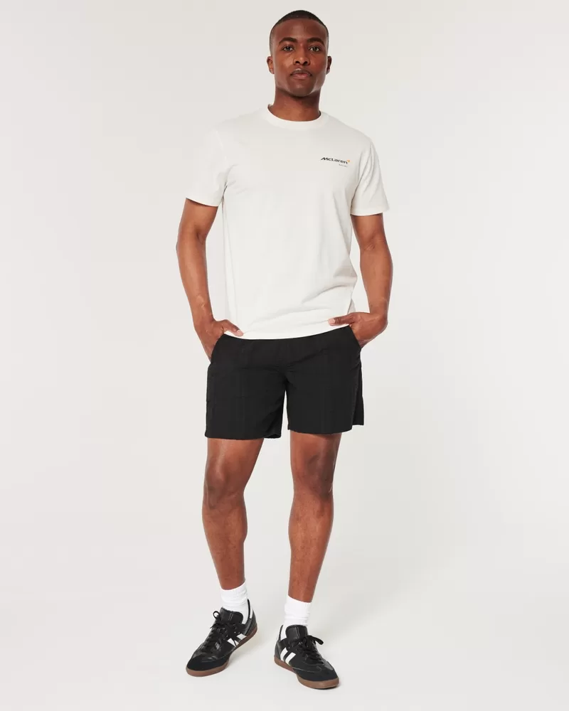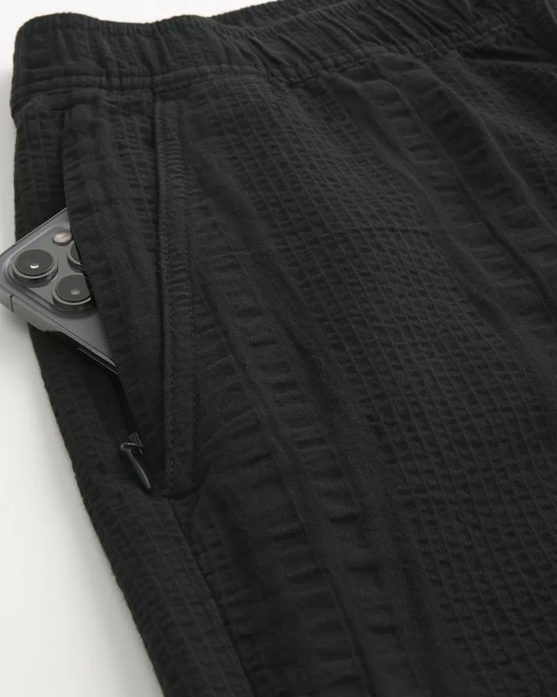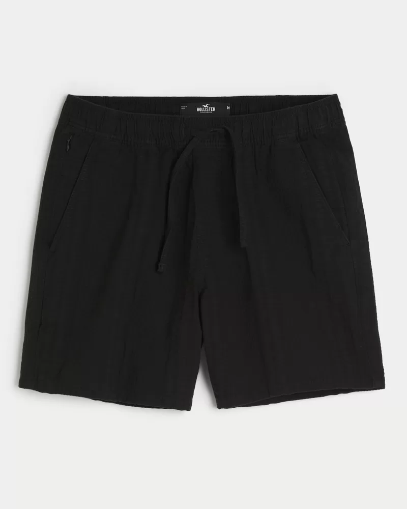 Soft and comfortable shorts in cotton seersucker fabric with a drawstring waist and pockets. Right zipper pocket, 7″ inseam. Imported.