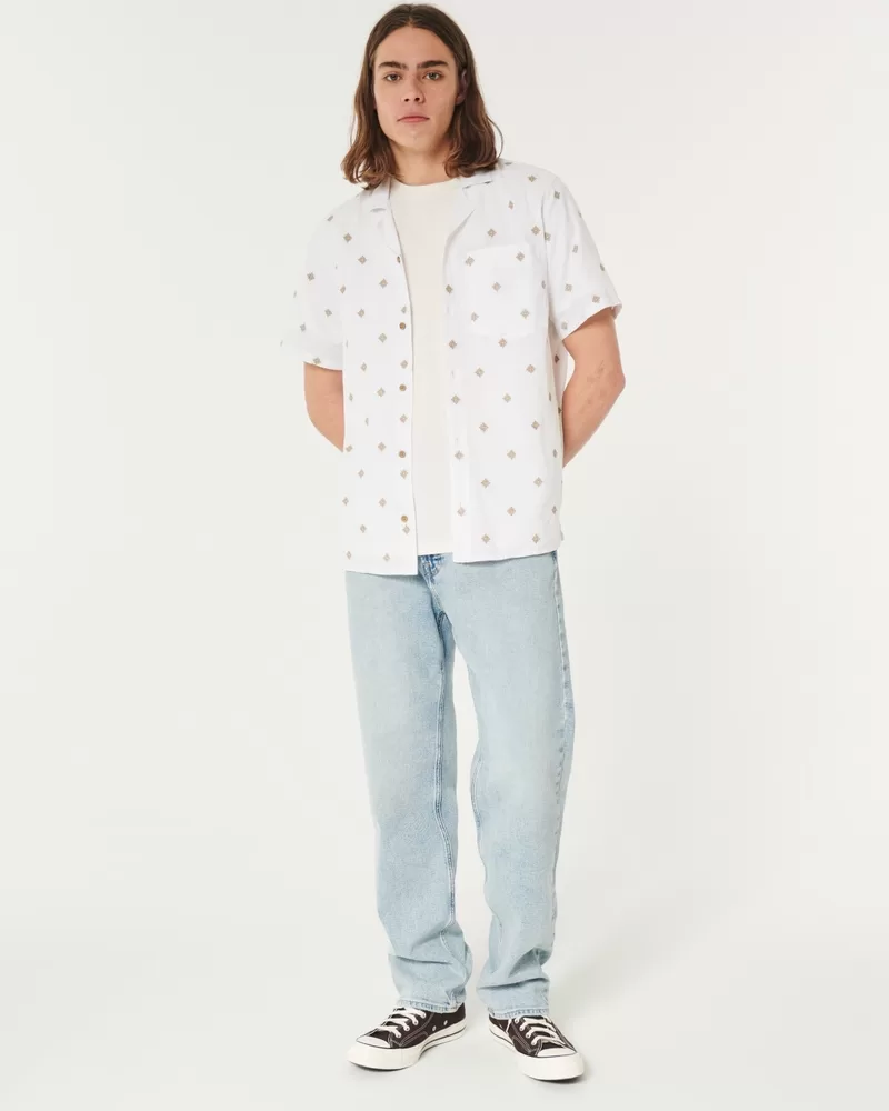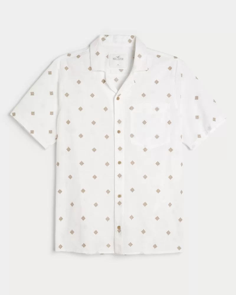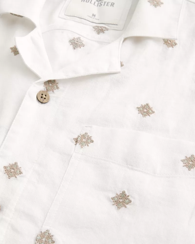 Comfortable and super soft, this shirt features a button-through closure, camp collar, left chest pocket and short sleeves. All-over embroidered pattern, soft linen-blend fabric. Relaxed Fit. Imported.
