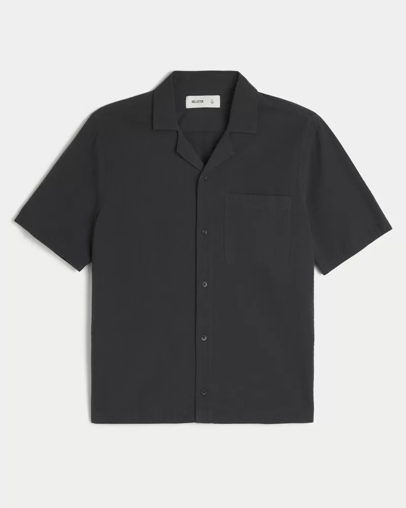 This classic button-through shirt is made with soft seersucker cotton fabric. Collar, short sleeves, left chest pocket. Imported.
