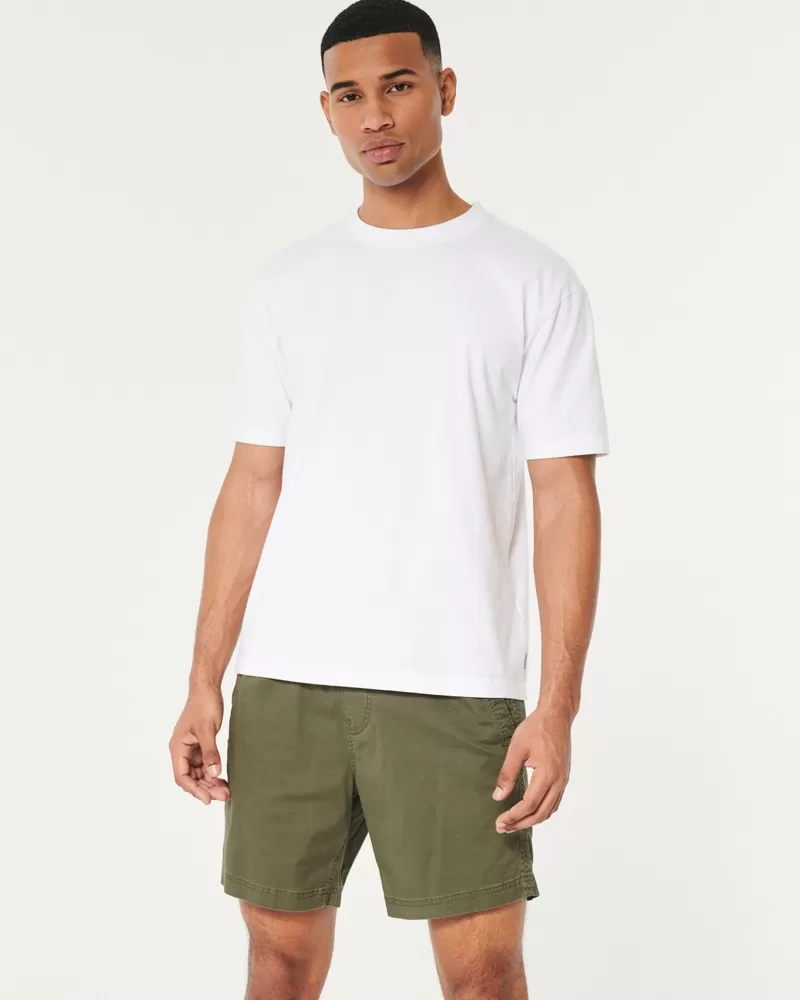 Comfortable pull-on shorts made with Hollister Epic Flex twill, featuring front pockets and a soft drawstring waist. Hidden phone pocket. Hits above the knee. 7″ inseam. Imported.
