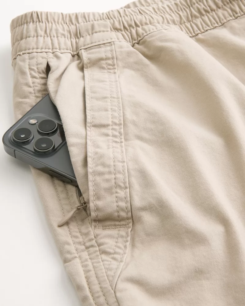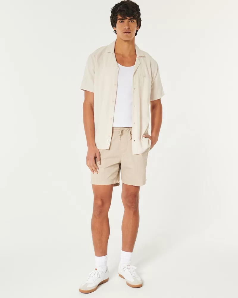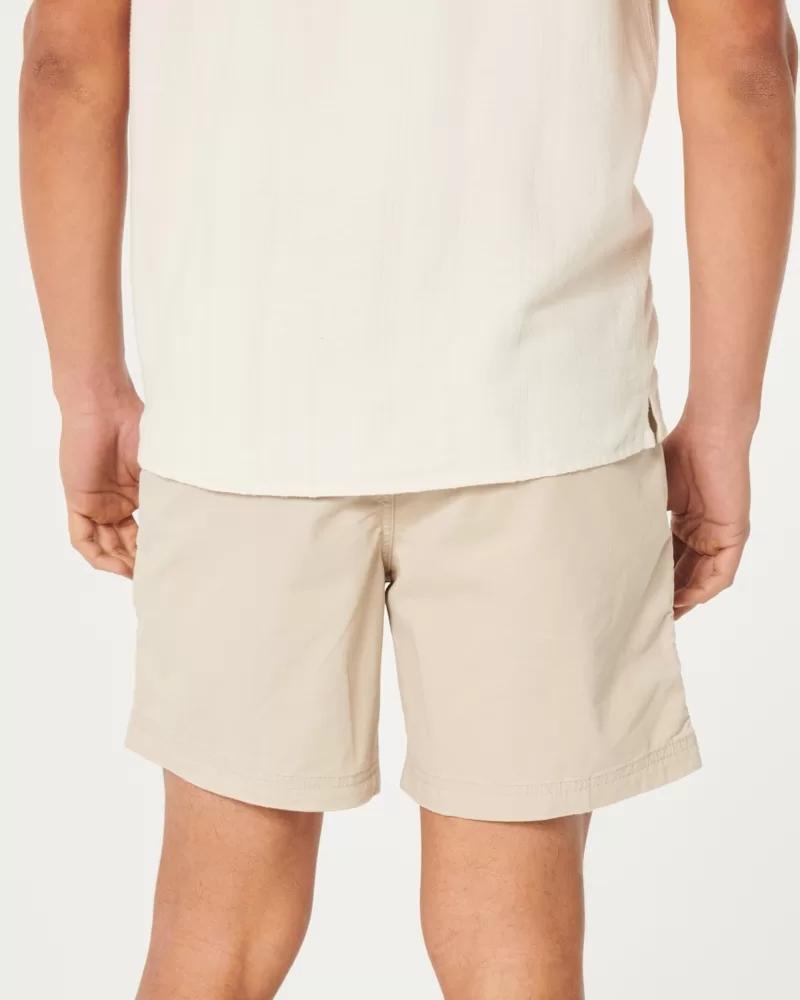 Comfortable pull-on shorts in our ultra-comfortable Hollister Epic Flex twill, featuring front pockets and a soft drawstring waist. Hits above the knee. 7″ inseam, hidden side zipper pocket. Imported.