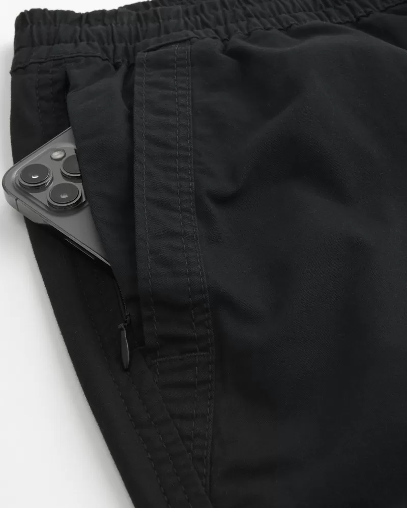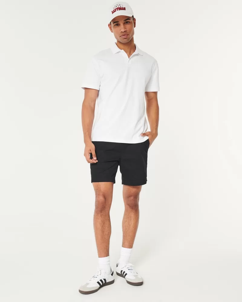 Comfortable pull-on shorts made with Hollister Epic Flex twill, featuring front pockets and a soft drawstring waist. Hidden phone pocket. Hits above the knee. 7″ inseam. Imported.